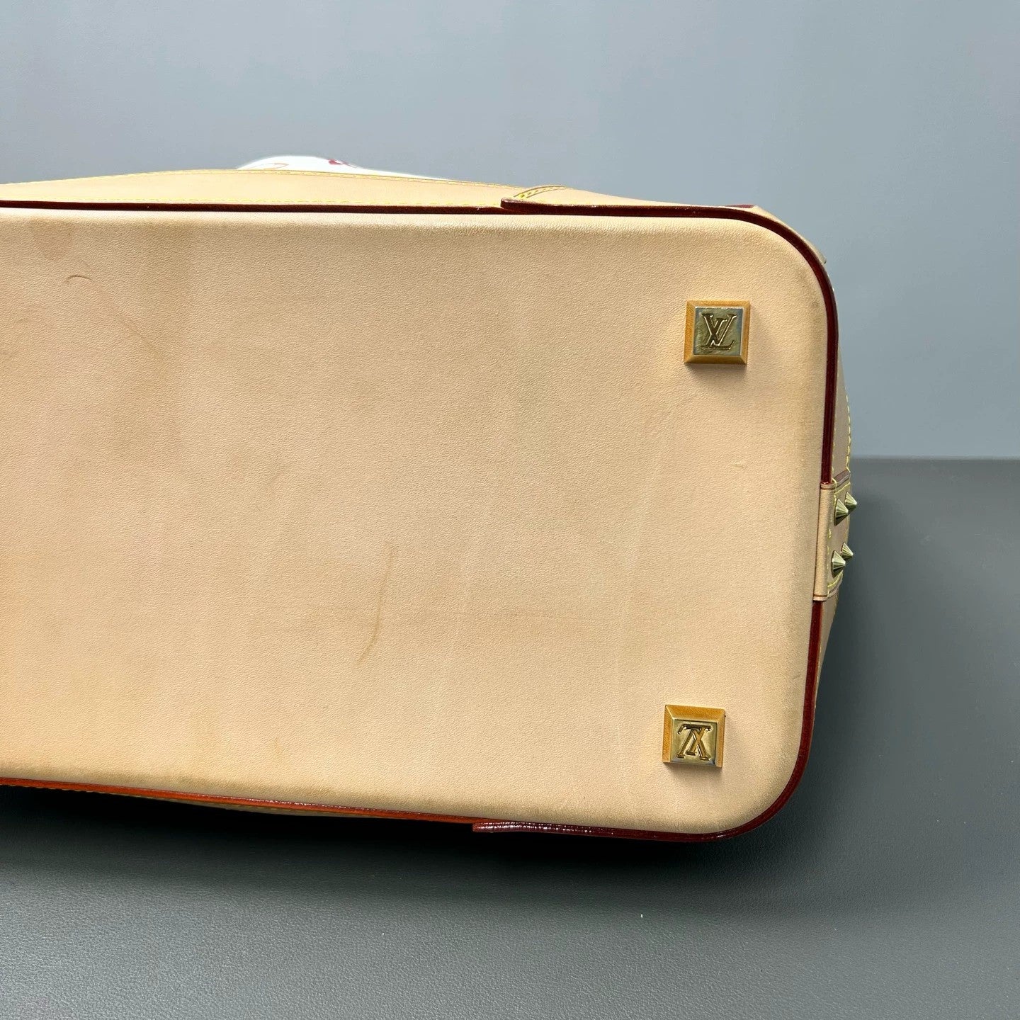 The bag features a distinctive white Monogram Multicolor coated canvas body, a collaboration design by Takashi Murakami. The Vachetta leather trim borders the top opening, handles, and reinforced base corners, accented with decorative gold-tone rivets. The top handles are crafted from Vachetta leather, and pleated details add structure and elegance to the front and back panels. Four protective gold-tone feet, embossed with the LV logo, guard the Vachetta leather base.