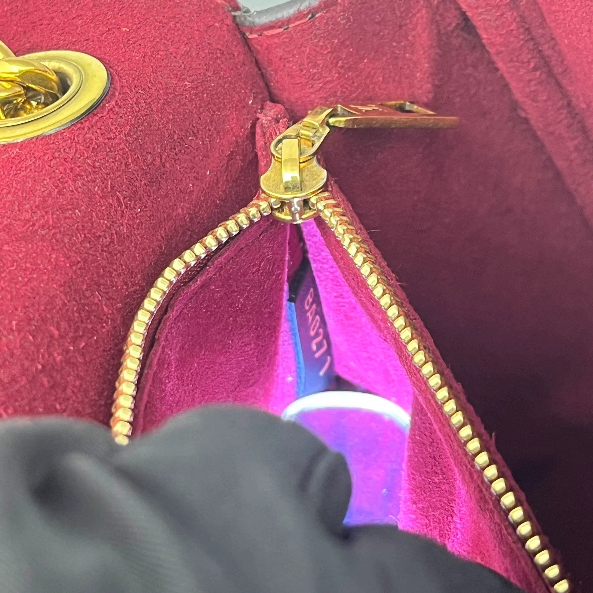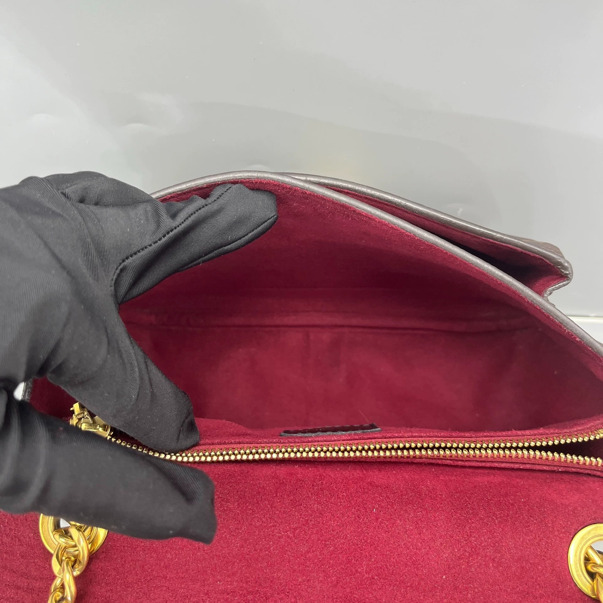 The interior is lined with a luxurious red microfiber, providing a soft contrast to the exterior. It features a main compartment and a flat slip pocket. The interior is clean, free from stains or odors, indicating very careful use.