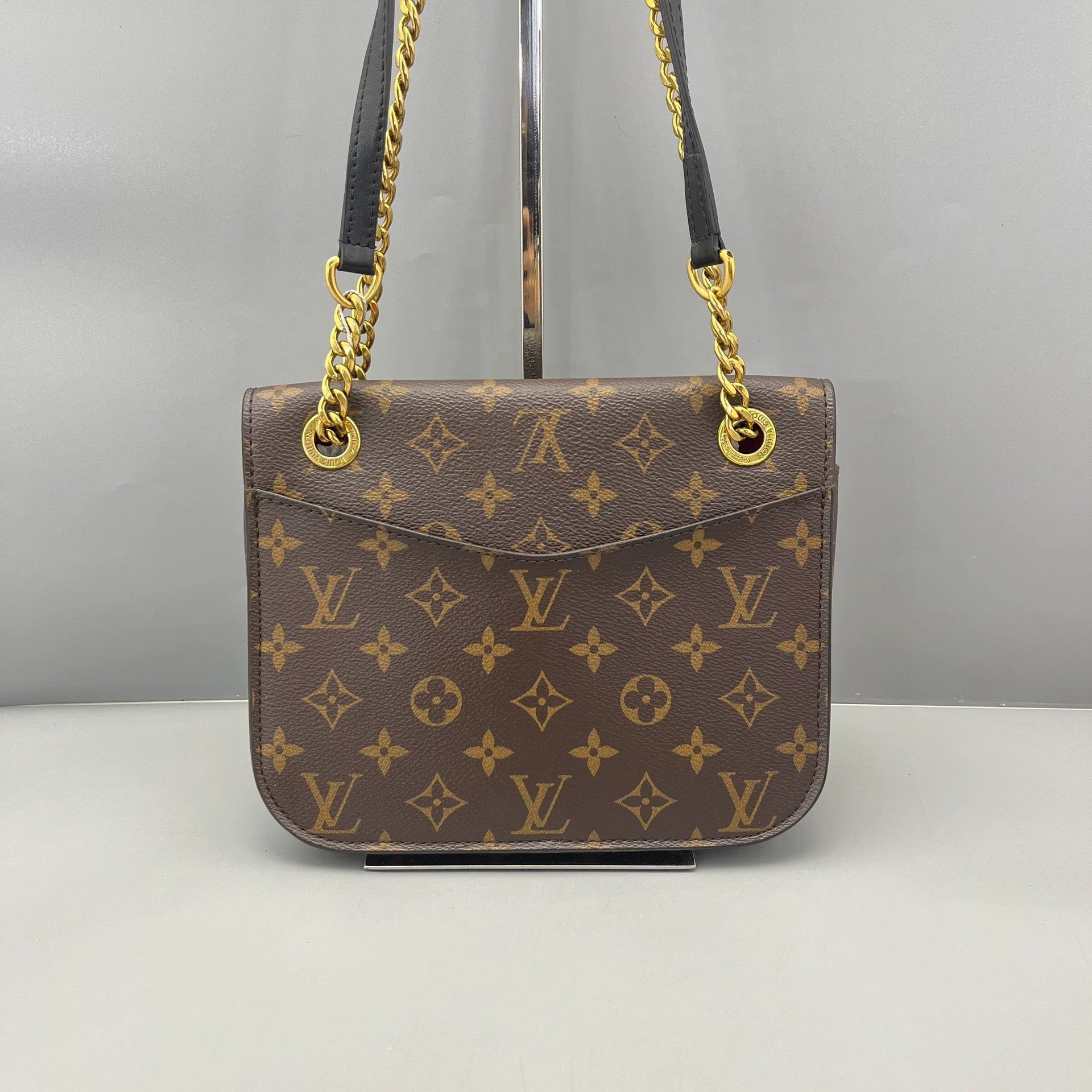 The distinctive black enamel and gold-tone 'LV' logo on the front flap is a striking design element of the Passy model. The bag's versatile chain strap allows it to be worn comfortably on the shoulder or as a crossbody.