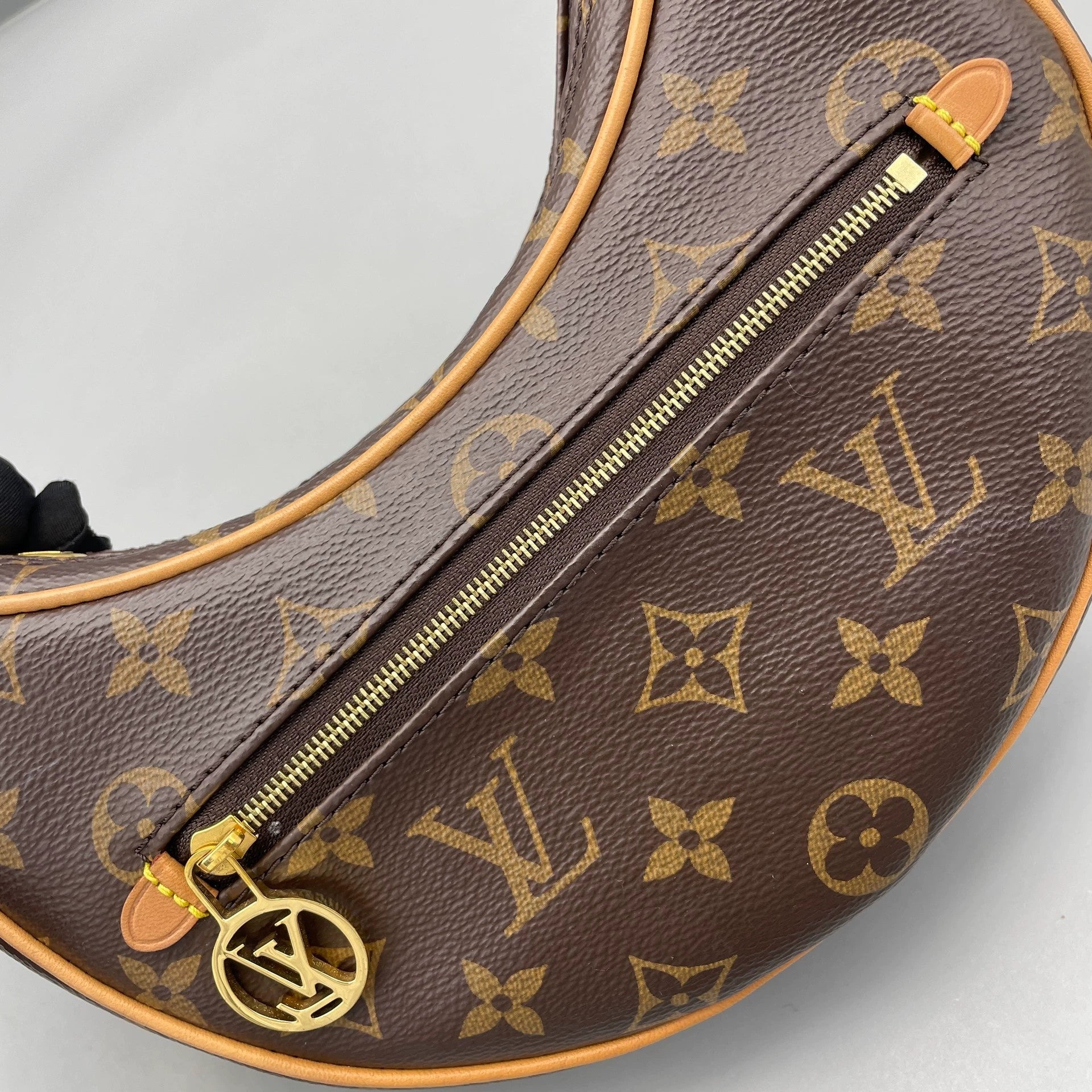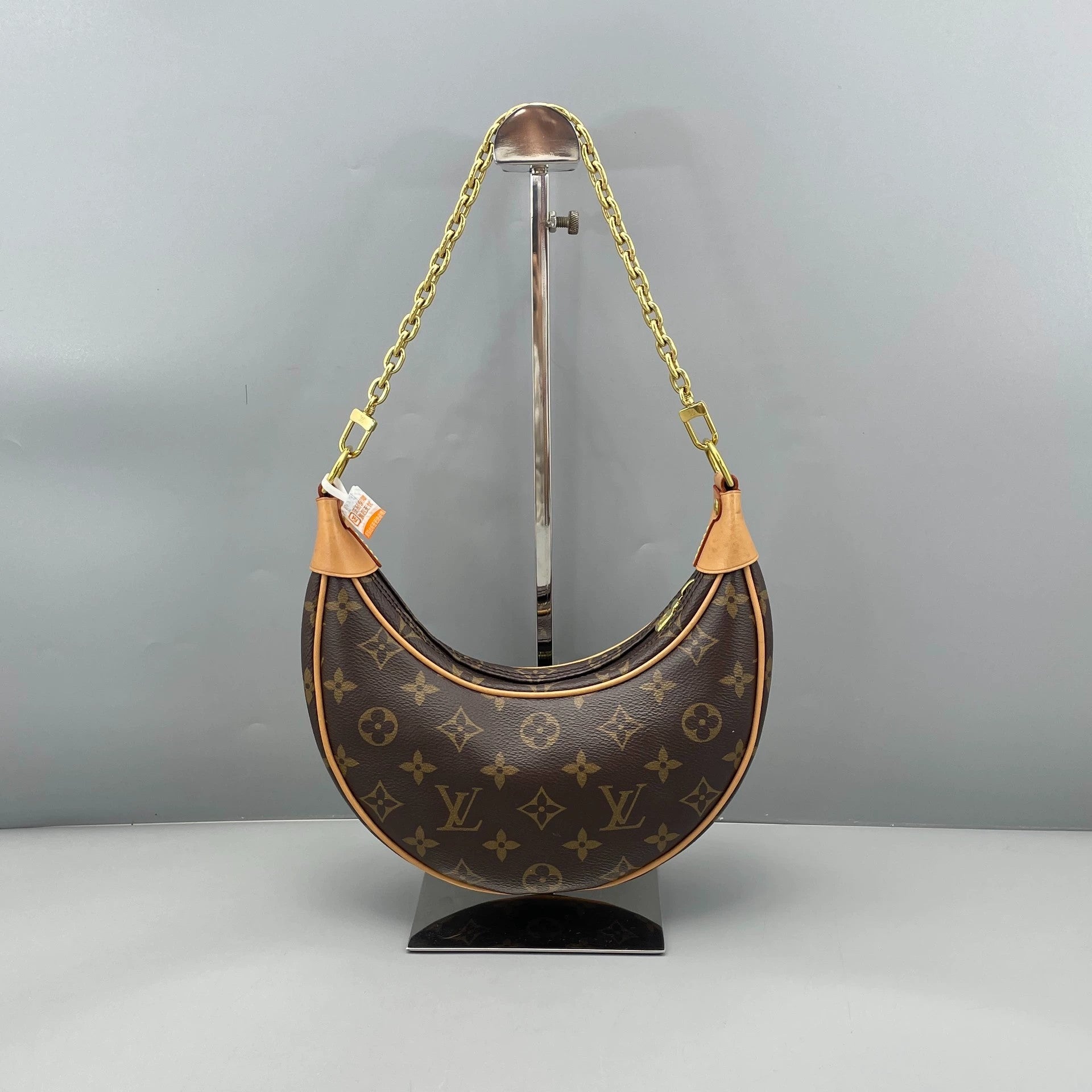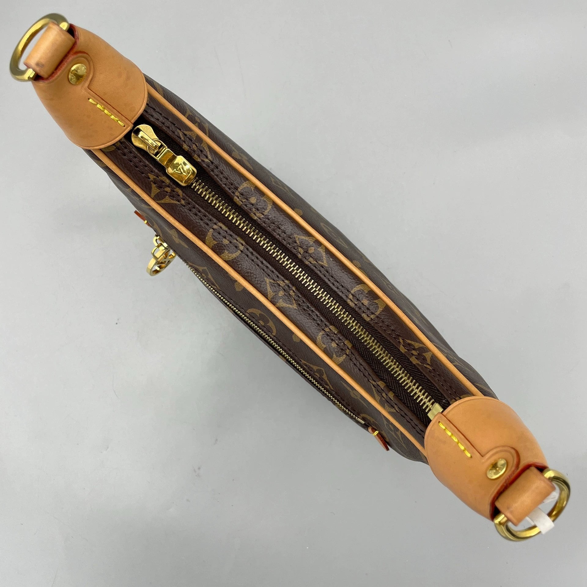 This Louis Vuitton Pea Bag is in excellent, almost new condition, retaining its pristine appearance and structure. The iconic Monogram coated canvas remains vibrant and free from significant marks or wear. The natural Vachetta leather trim and piping show only very faint signs of oxidation, indicating minimal prior use, and are a light honey patina. The gold-tone hardware is bright and shiny with no noticeable scratches or tarnishing. The interior is clean and well-preserved without any visible stains or odors.