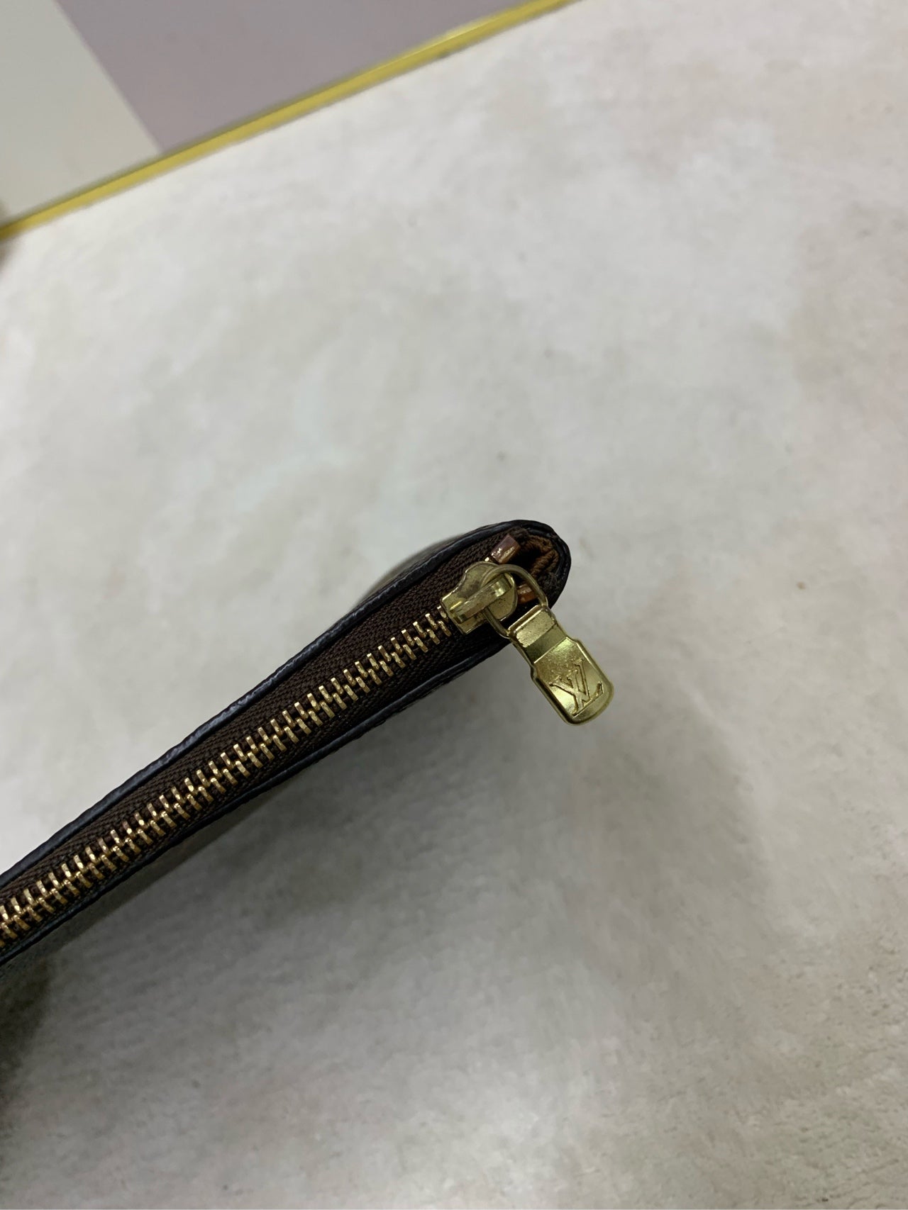 Equipped with a polished gold-tone zipper, smoothly functioning and securing the main compartment. The zipper pull is also gold-tone and bears the Louis Vuitton signature, showing minor surface wear.