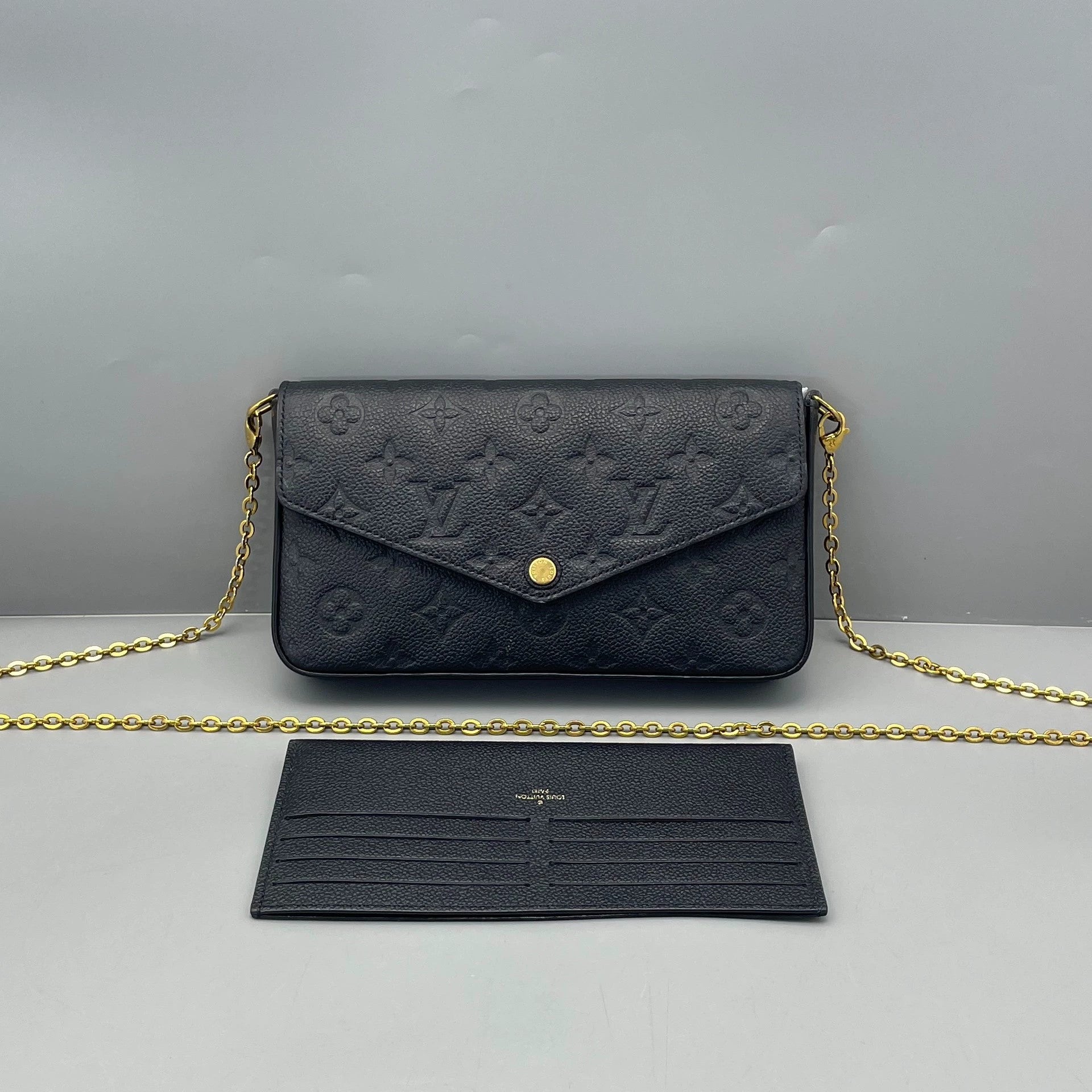 This Louis Vuitton Pochette Félicie in black Monogram Empreinte leather is in excellent pre-owned condition, rated at 97% new. The exterior leather is remarkably well-preserved with crisp embossed monogram detailing and minimal signs of wear. The gold-tone hardware, including the snap closure and D-rings, retains its luster with only faint hairline scratches consistent with gentle use. The interior is clean and shows no significant marks or damage. It is important to note that this particular item is missing one of the two removable inserts that typically accompany the Pochette Félicie, specifically the zippered pouch. The removable flat card holder is included and in excellent condition.