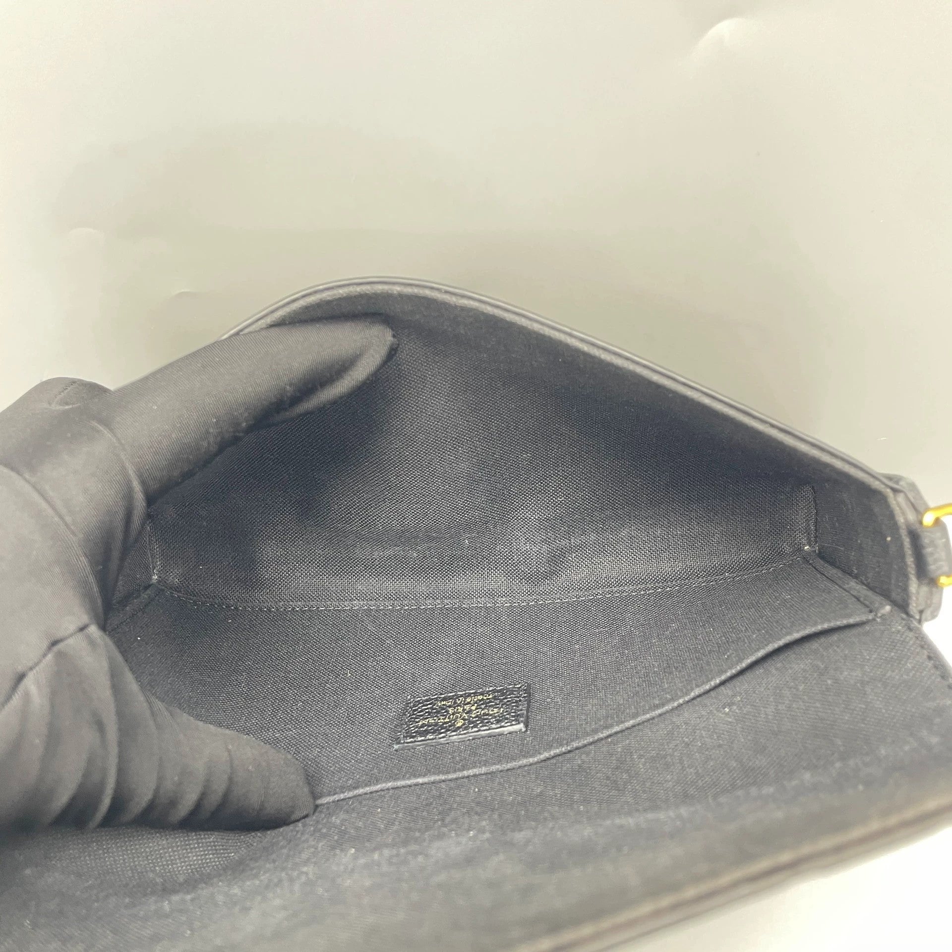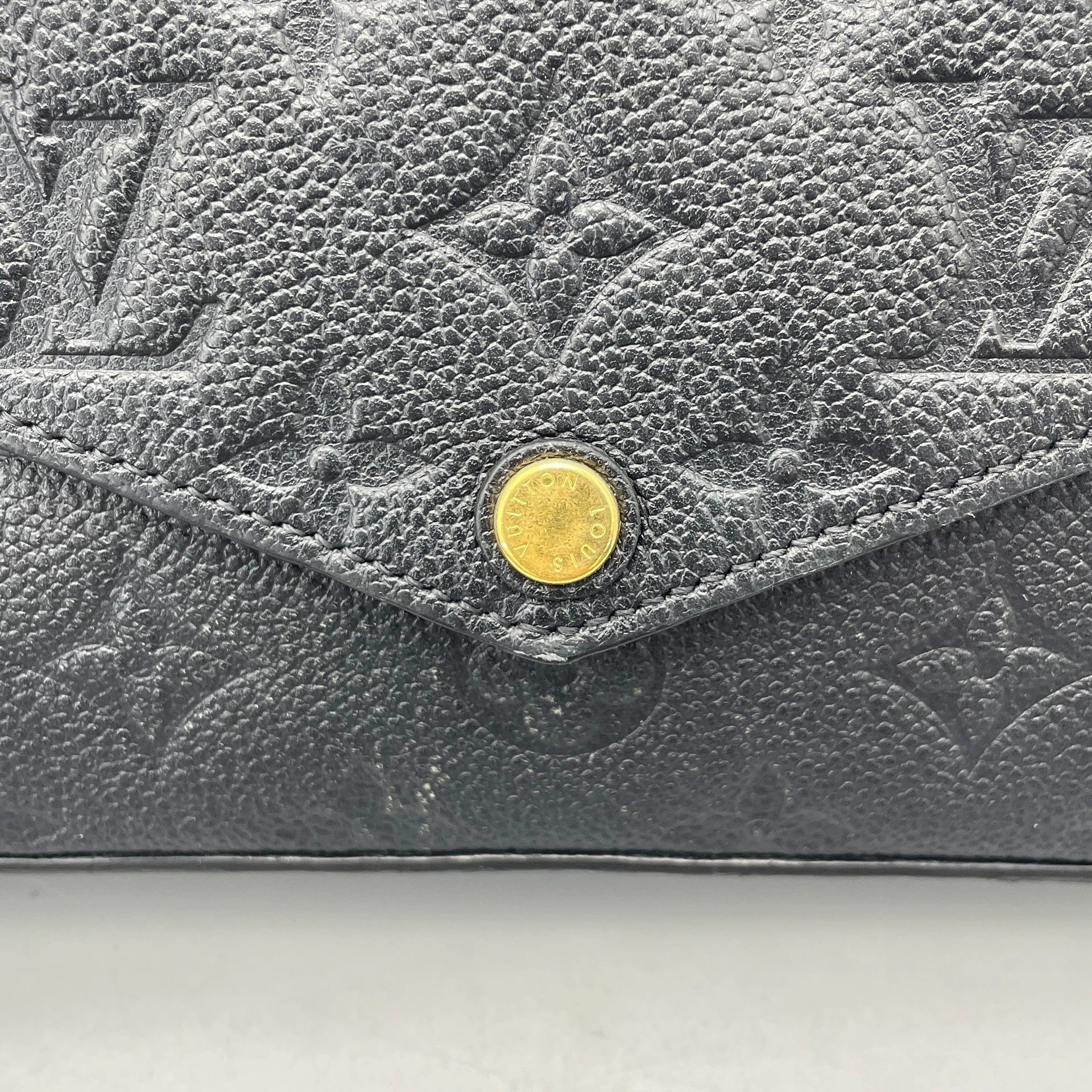 Crafted from supple black Monogram Empreinte leather, featuring Louis Vuitton's iconic monogram pattern subtly embossed into the grained leather. The structured envelope-style flap closes securely with a gold-tone snap button. The overall silhouette is well-maintained, and the leather shows negligible creasing or scuffing.