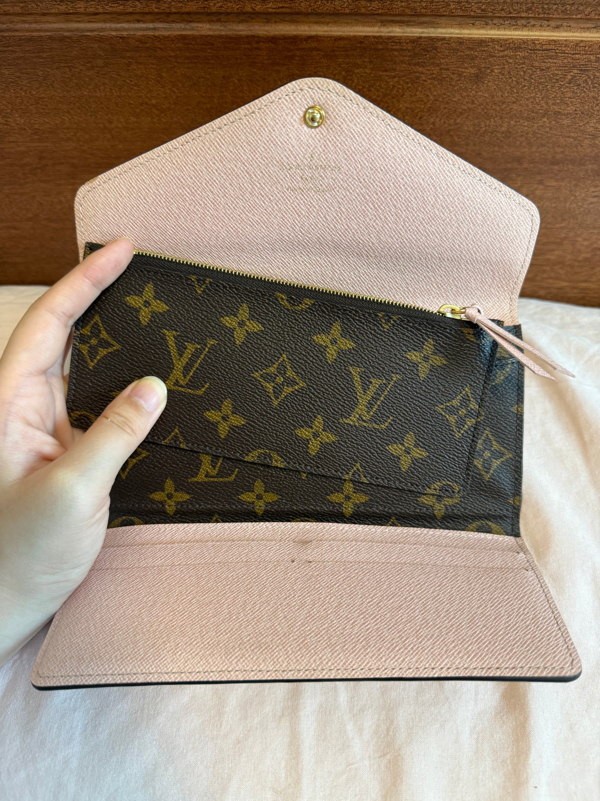 The interior is lined with a soft yet durable pink grained leather, offering a striking and feminine contrast to the Monogram exterior. It is meticulously organized with multiple card slots, a full-length bill compartment, and an additional flat pocket for receipts or notes. A versatile removable Monogram canvas zipped pouch is included for coins or small essentials.