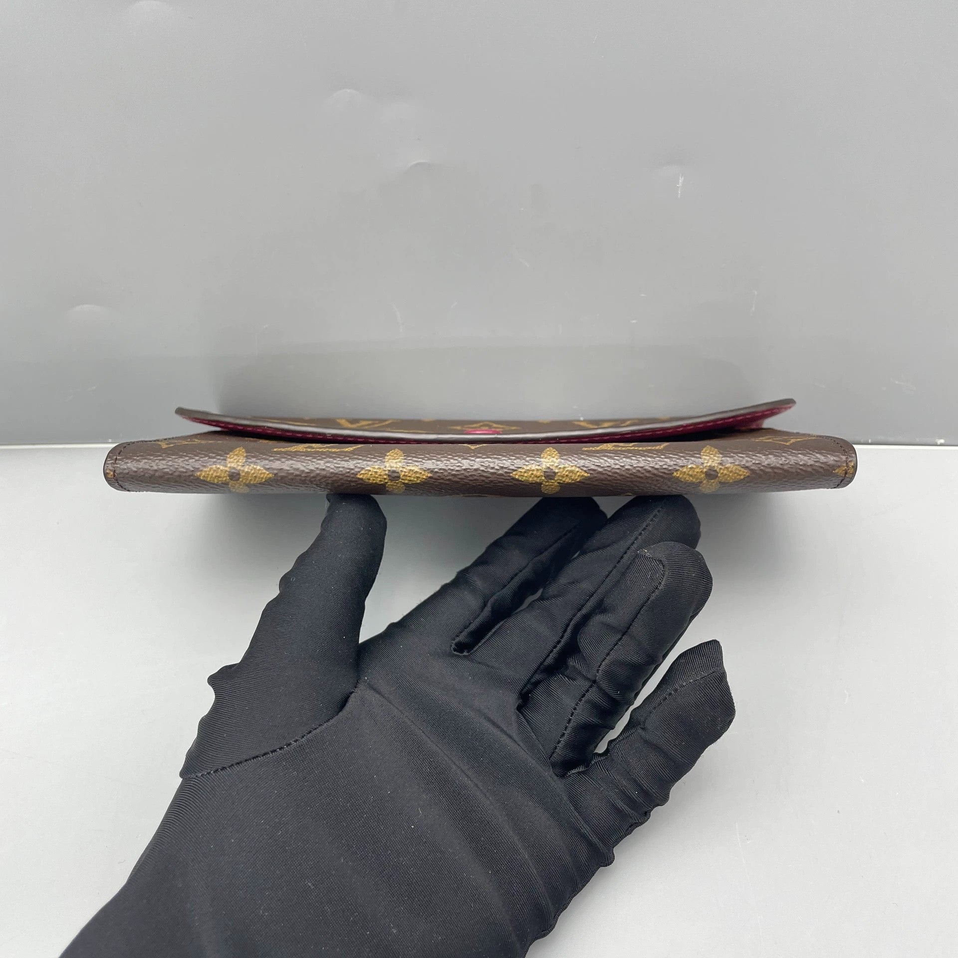 This Louis Vuitton Portefeuille Sarah wallet is in excellent pre-owned condition, rated at 97%. The iconic Monogram canvas exterior shows minimal signs of wear, maintaining its rich brown tone and distinct pattern. The vibrant purple-red snap button closure is fully functional and secure. The interior is remarkably clean with no significant marks or scuffs. All hardware, including the gold-tone snaps and zipper, functions smoothly with only negligible signs of use. The overall structure is well-preserved, showing very little creasing or deformation.
