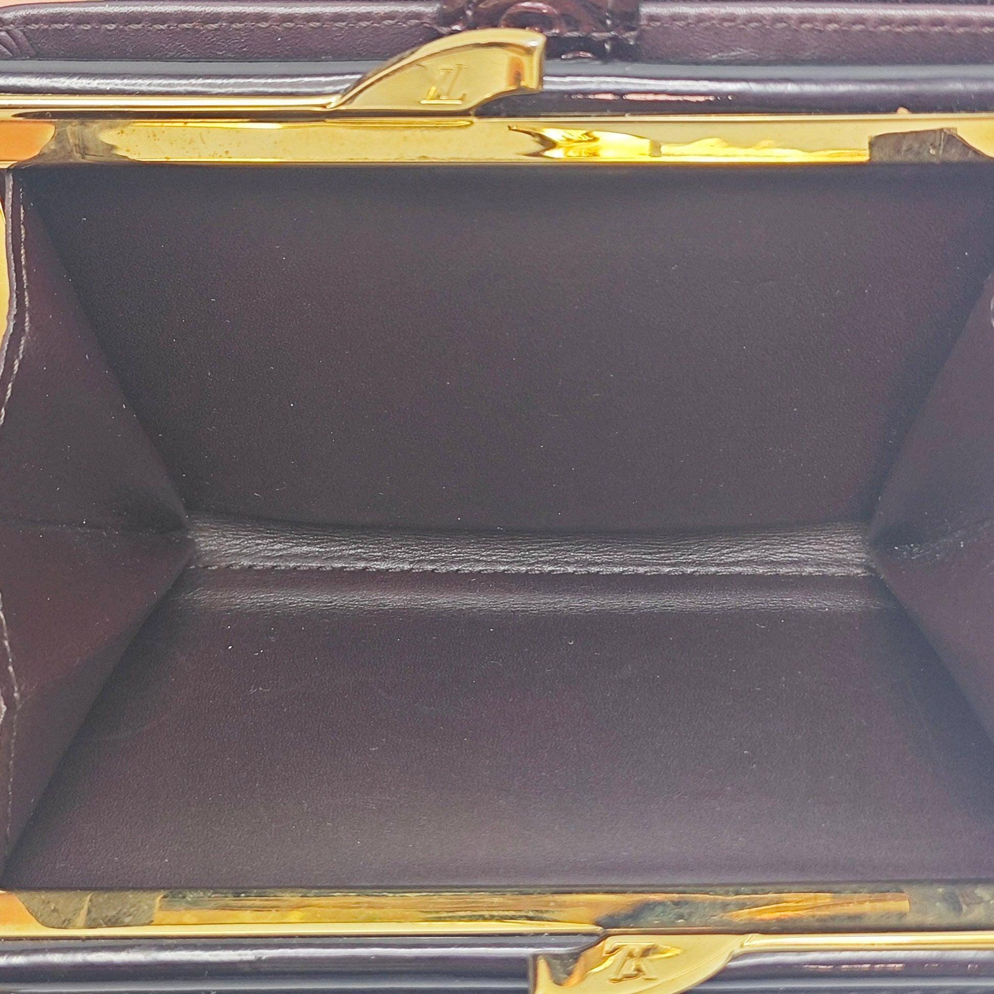 Features polished gold-tone hardware, including the LV-engraved snap button closure on the exterior tab and a prominent kiss-lock frame for the coin compartment, also adorned with an engraved 'LV' logo on the clasp. All hardware is functional and shows only minor hairline scratches.