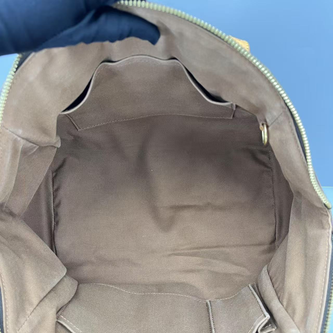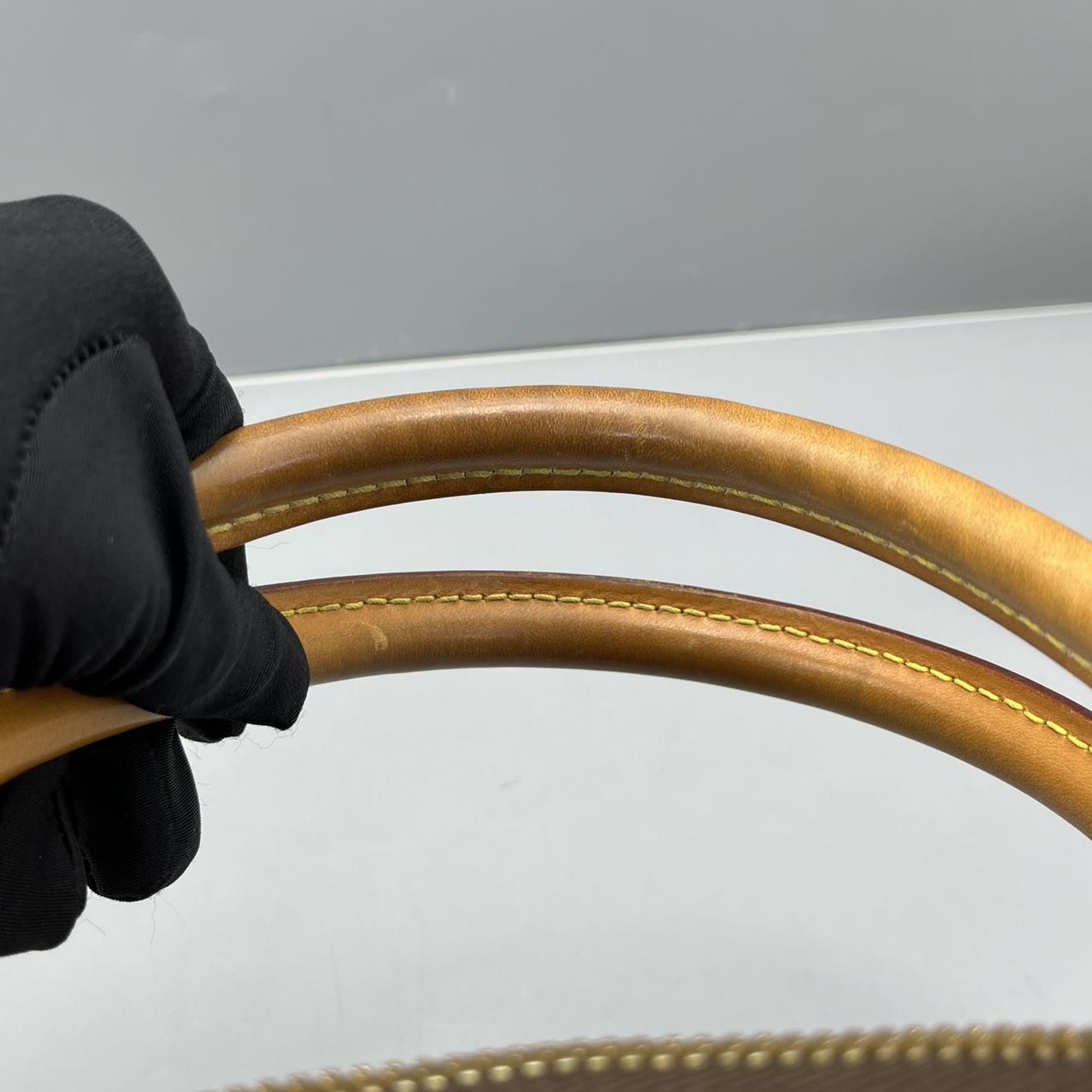 This Louis Vuitton Tivoli PM bag is in very good pre-owned condition, reflecting minimal signs of use for its age. The iconic Monogram coated canvas exterior remains vibrant and largely free of significant marks or wear, maintaining its appealing pleated structure. The Vachetta leather trim and handles have developed a desirable honey patina, characteristic of well-maintained vintage Louis Vuitton pieces, with only minor darkening and gentle wear on the handles. The piping around the edges is mostly intact with faint signs of use. Gold-tone hardware exhibits slight surface scratches consistent with gentle handling, particularly on the zipper pull and protective base studs, but remains functional and shiny. The interior is clean with no noticeable stains or odors.