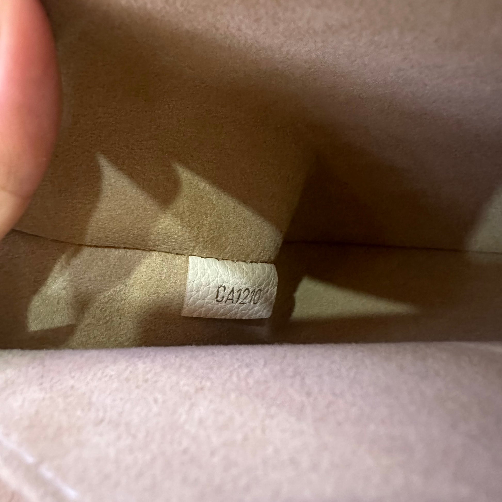 The interior is lined with a soft, light beige microfiber material, offering a clean and protected space. It features a main compartment with a single flat slip pocket for organization. A leather tag bearing the Louis Vuitton signature is stitched within.