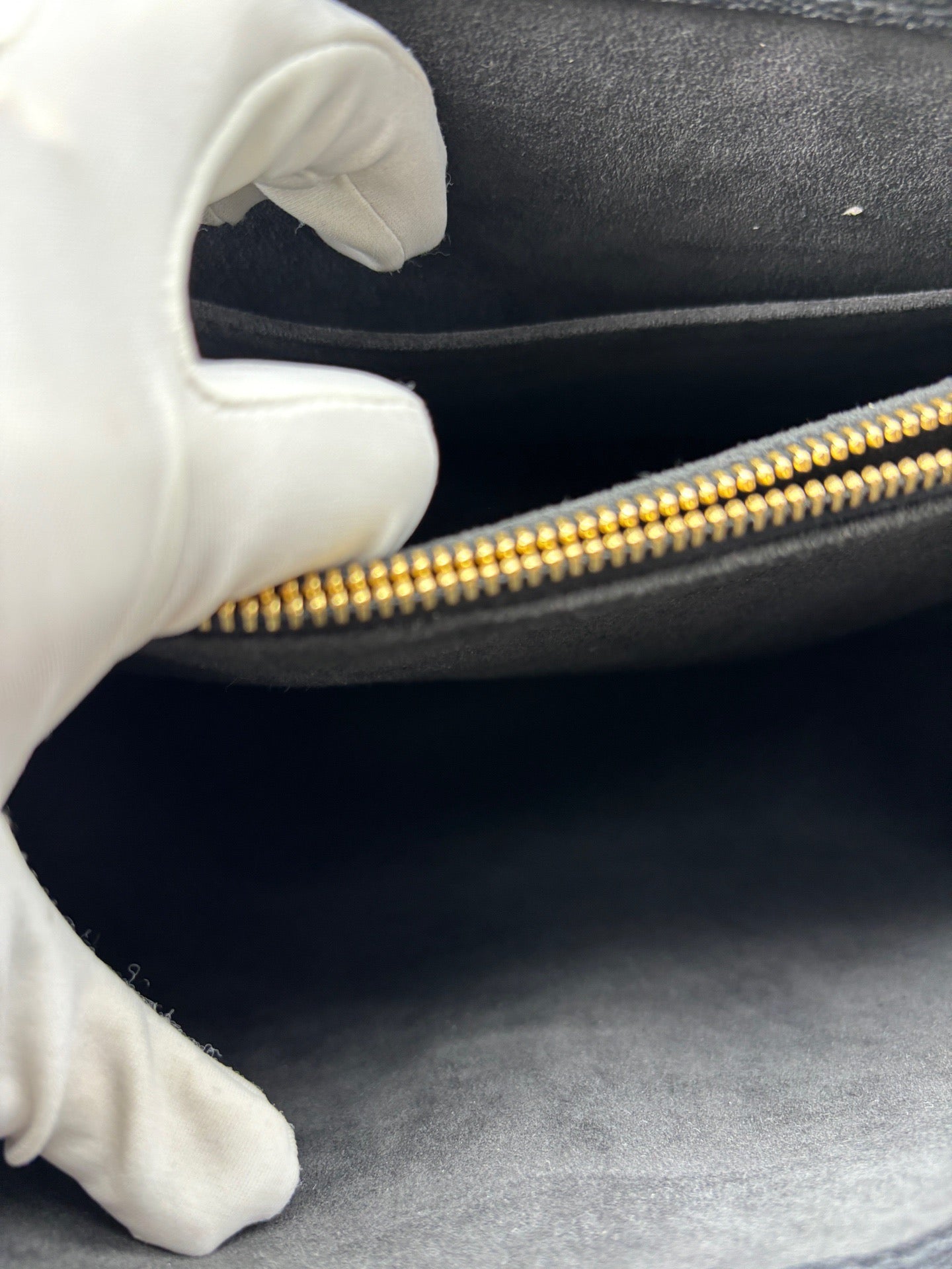 The interior is lined with a dark grey/black microfiber material, providing a luxurious suede-like feel. It features a main compartment, along with a flat pocket and a zippered pocket for organization. The interior appears impeccably clean with no stains or damage.