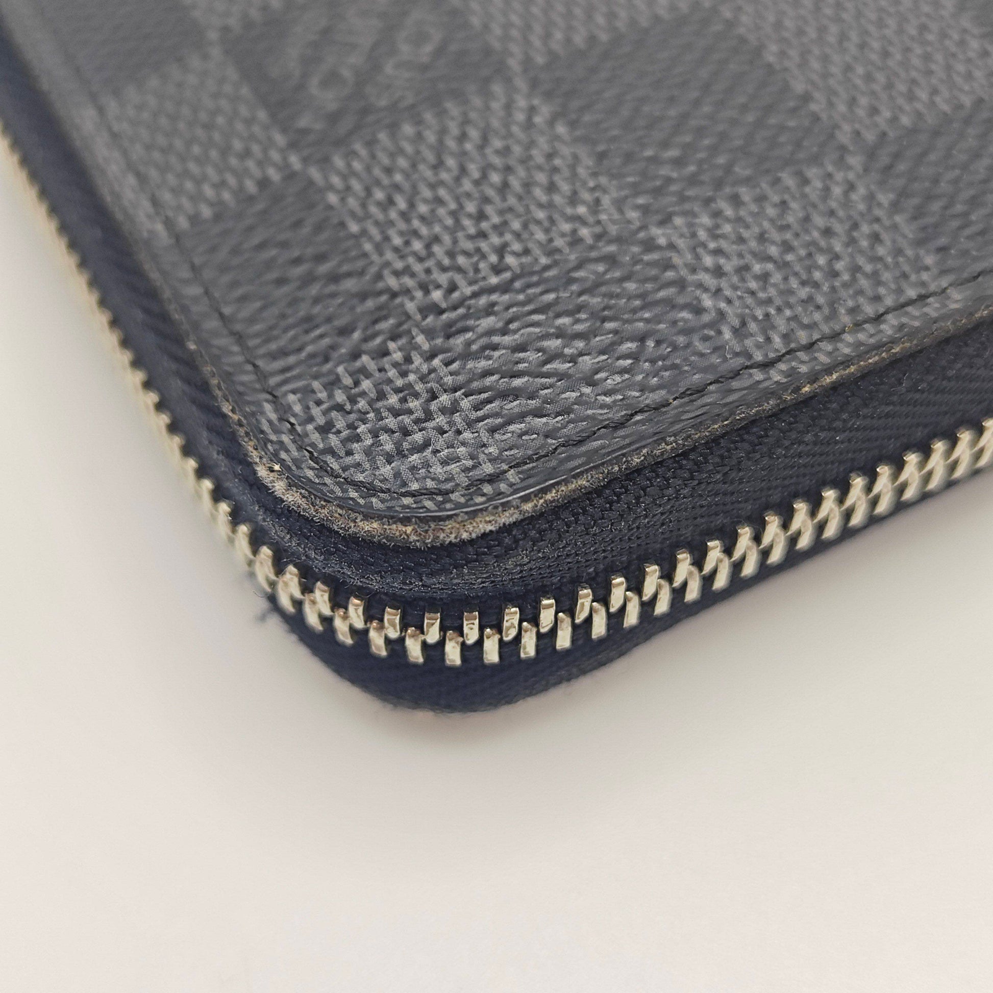 Crafted from Louis Vuitton's durable Damier Graphite coated canvas, featuring the iconic black and grey checkerboard pattern. The wallet has a full zip-around closure. Edges and corners show wear, including some peeling of the protective glazing. A distinct scuff is visible on the side canvas, indicative of past friction or impact.