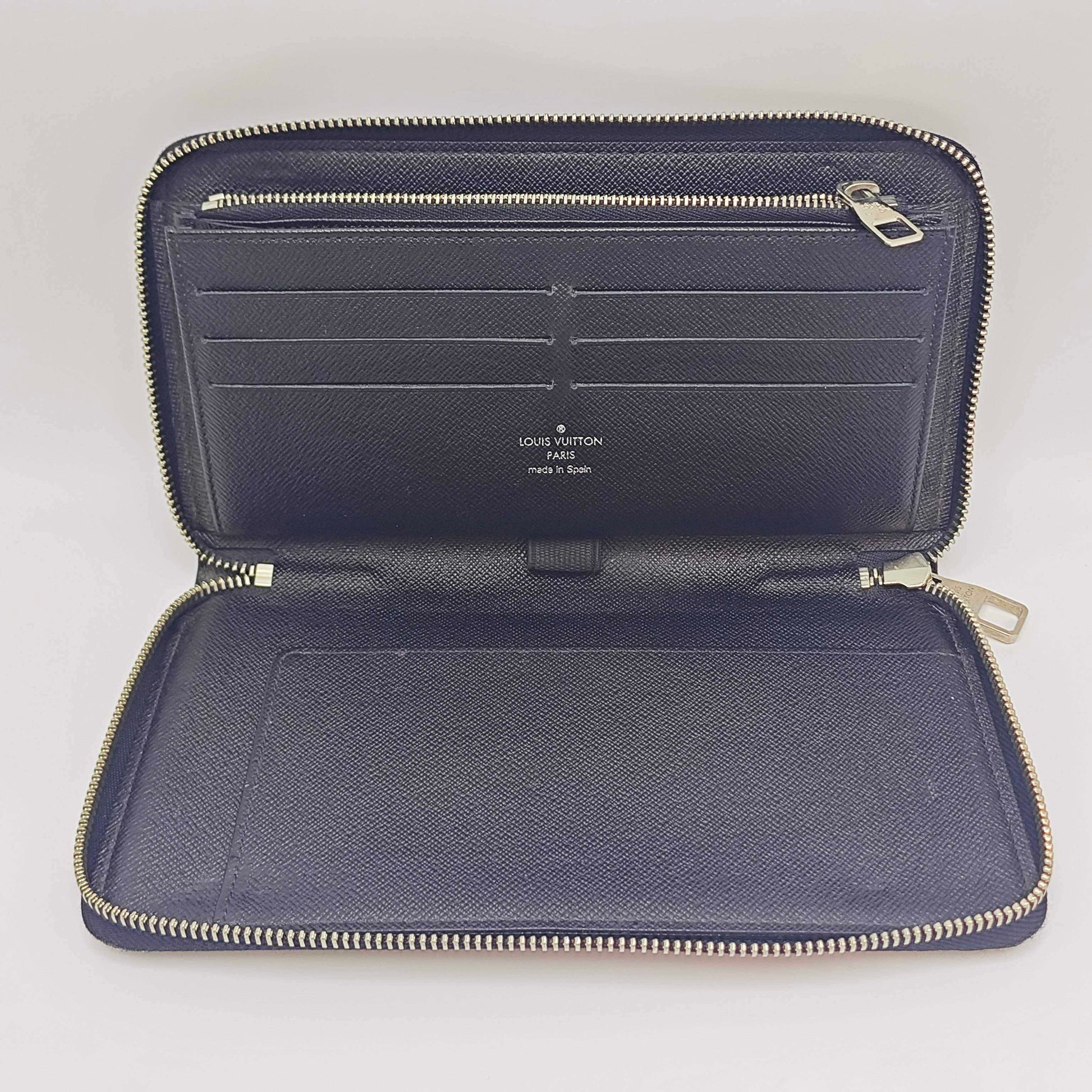 Equipped with silver-tone metal hardware, including a sturdy zip-around closure that functions smoothly. The zipper pull is engraved with 'LOUIS VUITTON' and displays some surface wear and light tarnishing.