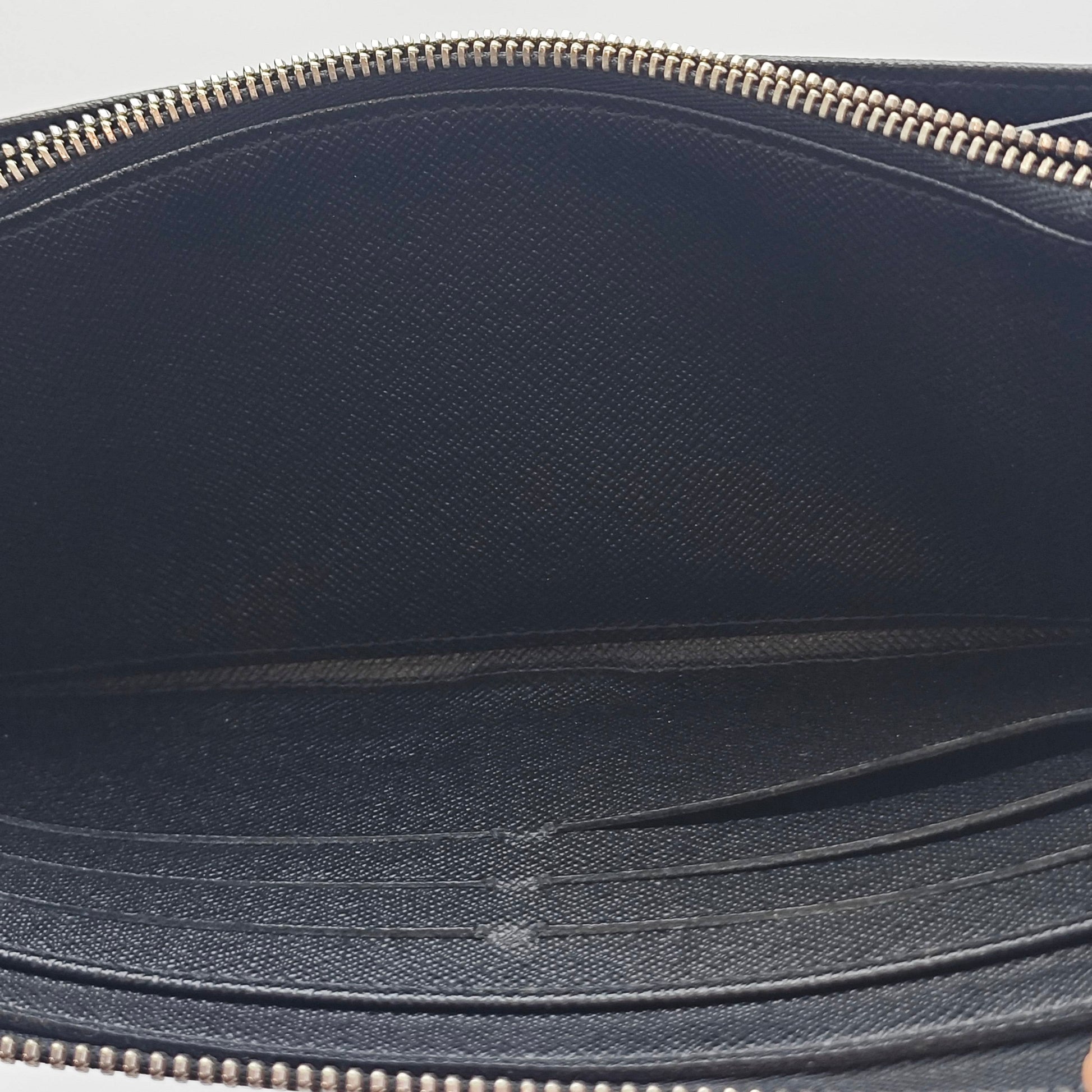The interior is lined with a dark, grained leather, offering a luxurious contrast to the exterior. It is well-organized with multiple card slots, several large bill compartments, and a central zippered pocket for coins, which maintains good cleanliness.