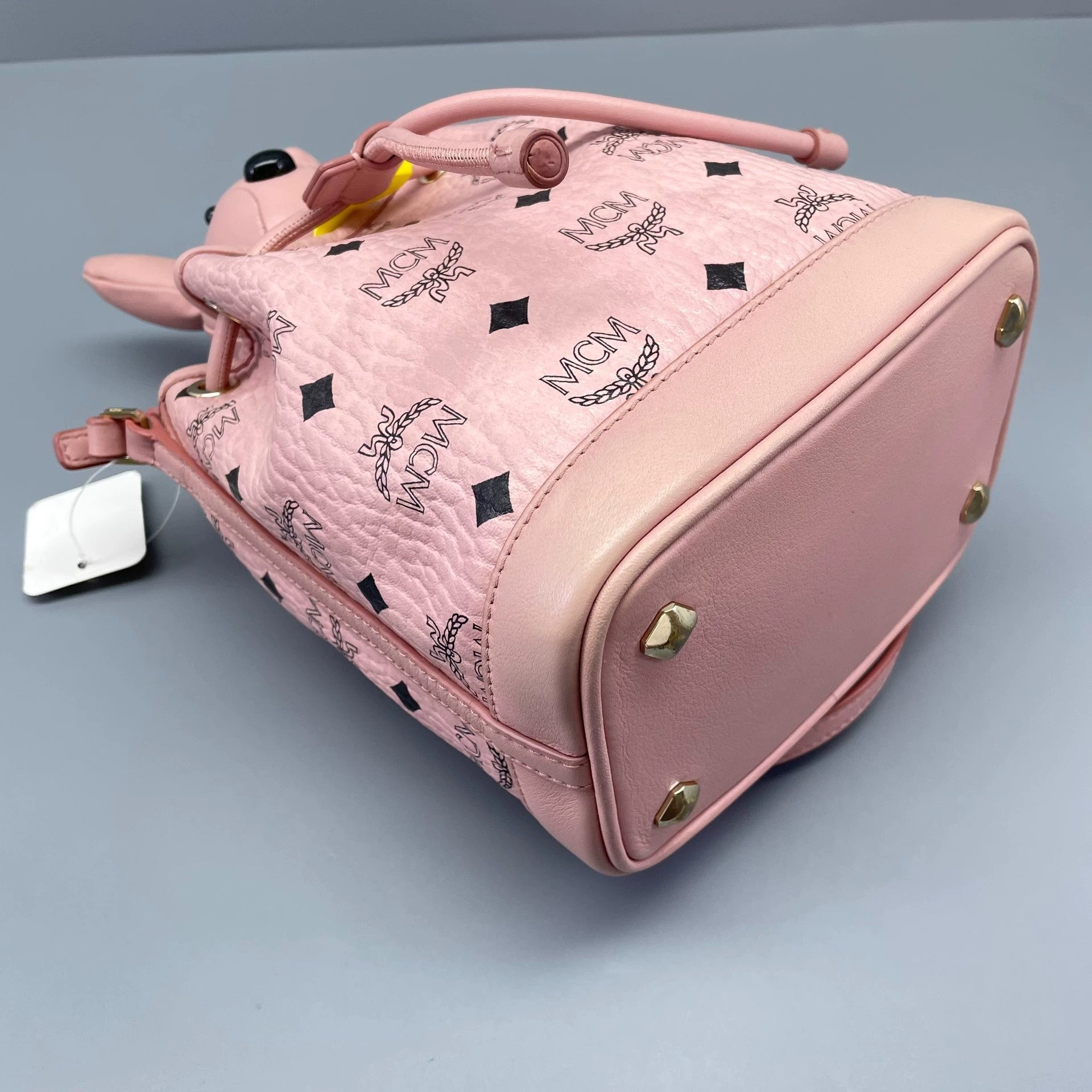 A key distinguishing feature is the detachable pink leather rabbit charm, which also bears the MCM Visetos monogram on its body and has a gold-tone keyring loop. This playful addition enhances the bag's unique and whimsical character.