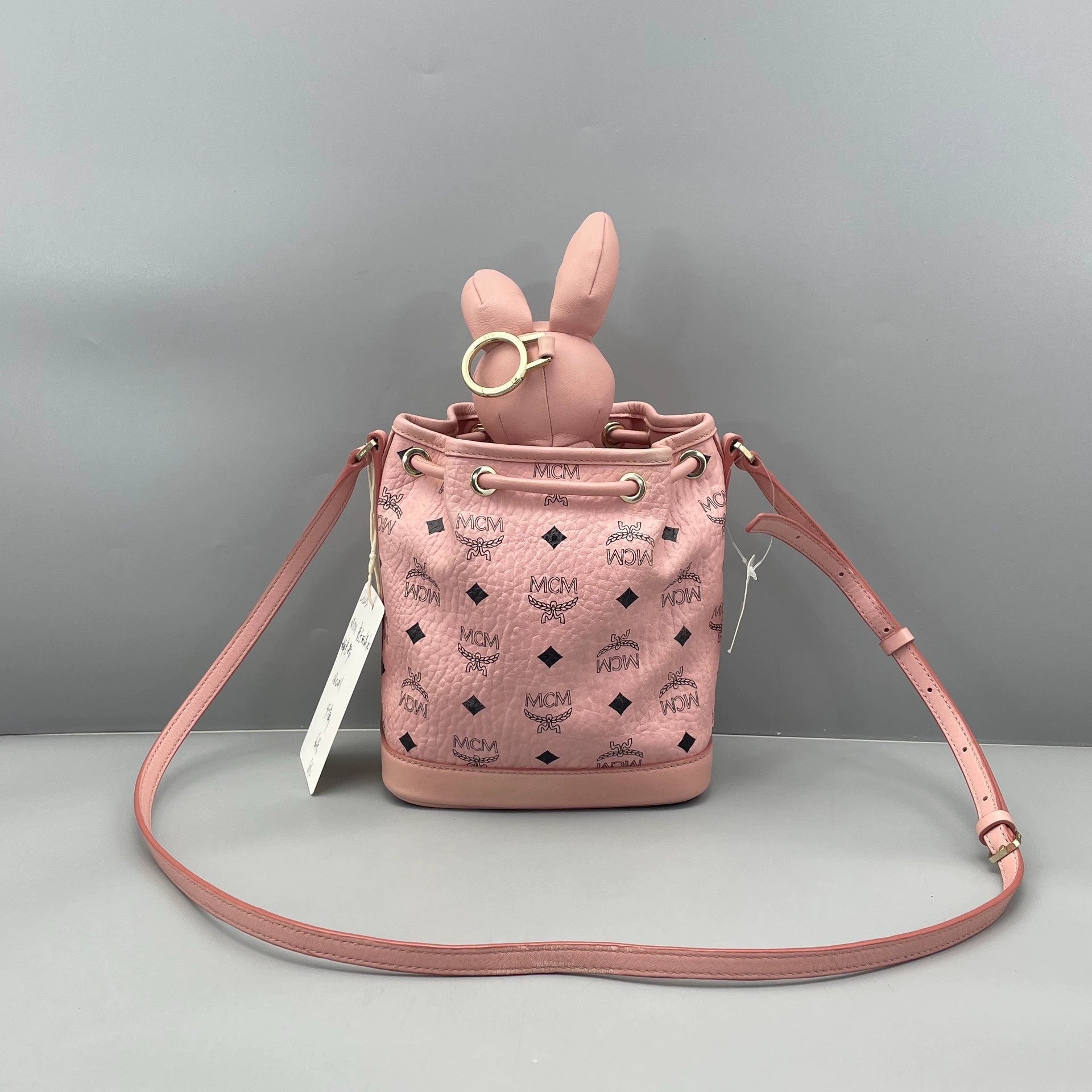 This MCM Visetos Rabbit Bucket Bag is presented in an almost new, 97% new condition. The exterior leather is vibrant pink with crisp black monogram print, showing minimal to no signs of wear. The gold-tone hardware is bright and shiny with no noticeable tarnishing or scratches. The interior lining is clean with no stains or marks. The detachable rabbit charm is also in excellent condition, matching the bag's overall pristine appearance. The bag maintains its original structure.