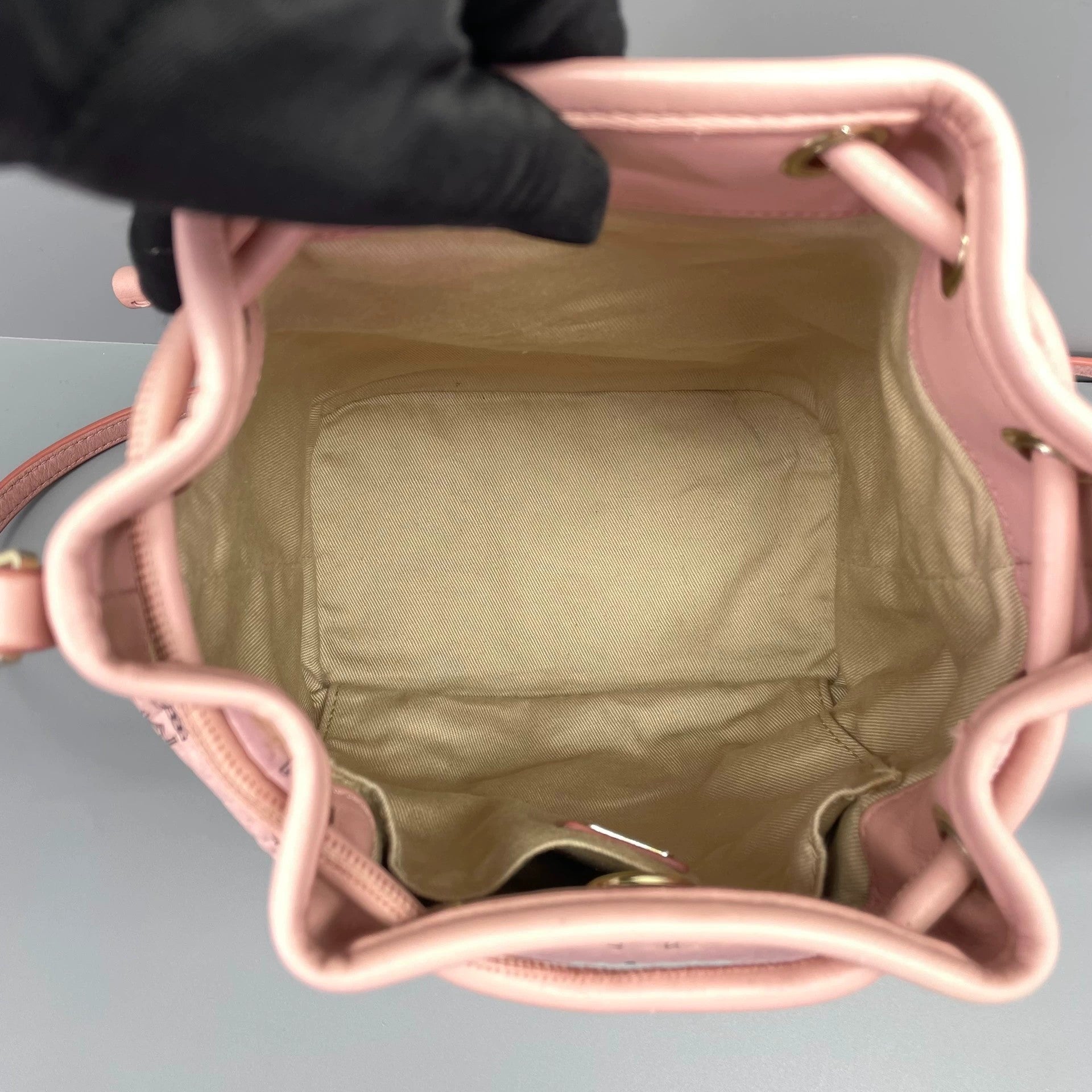 All hardware is crafted from polished gold-tone metal, including the eyelets for the drawstring, the strap buckles, and the protective feet on the base. The hardware is in excellent condition, retaining its luster.