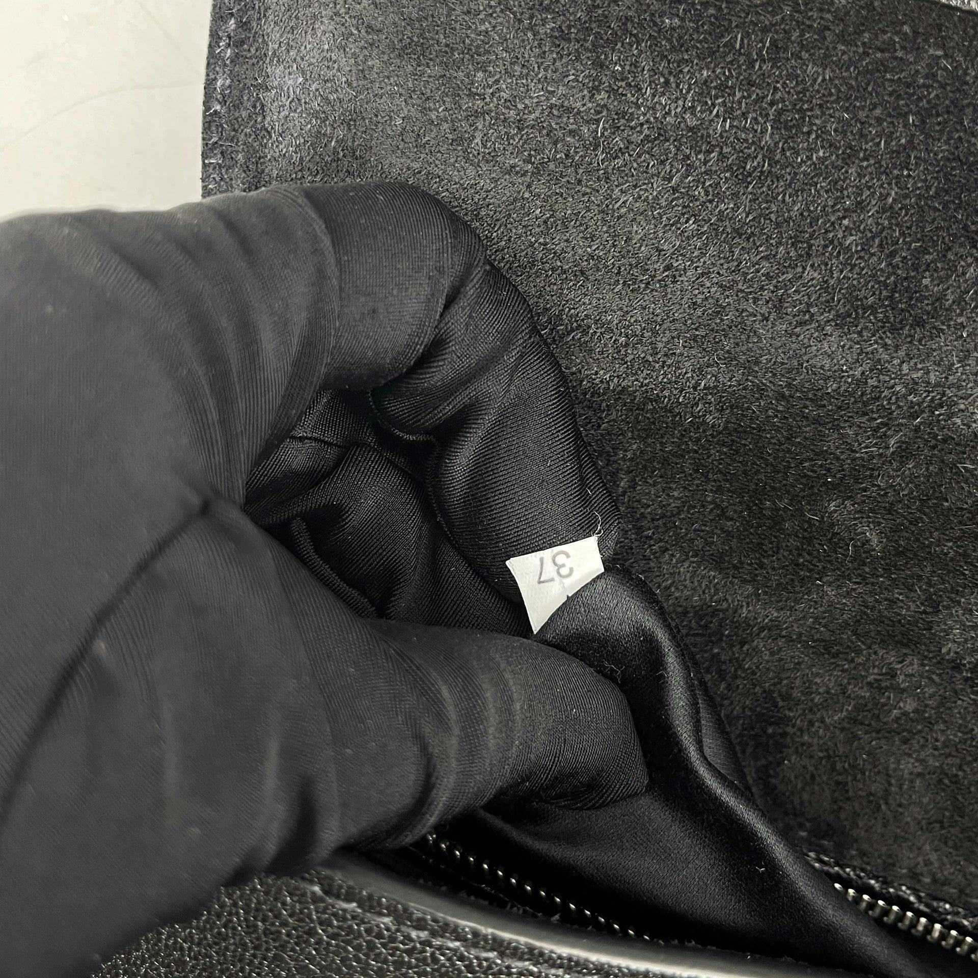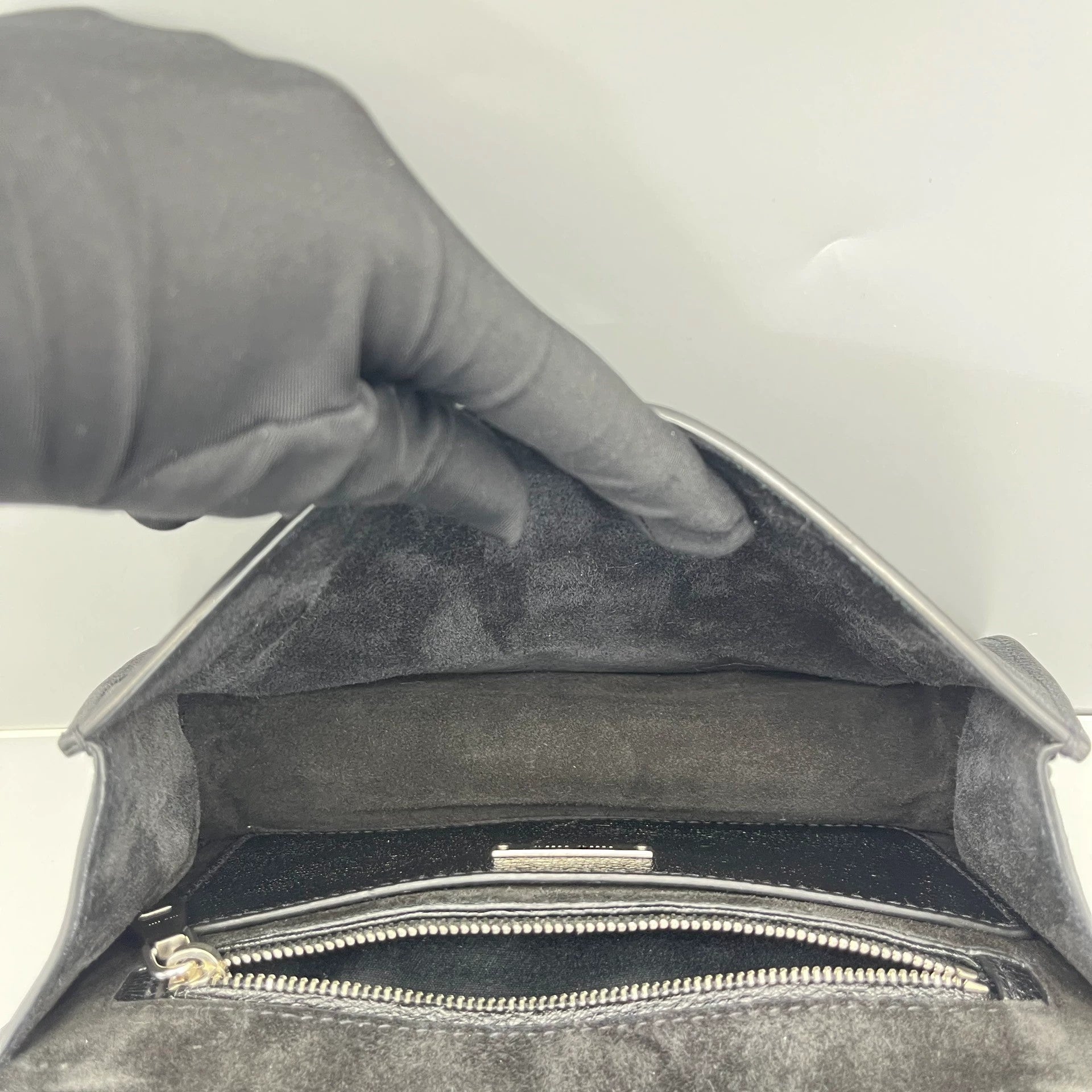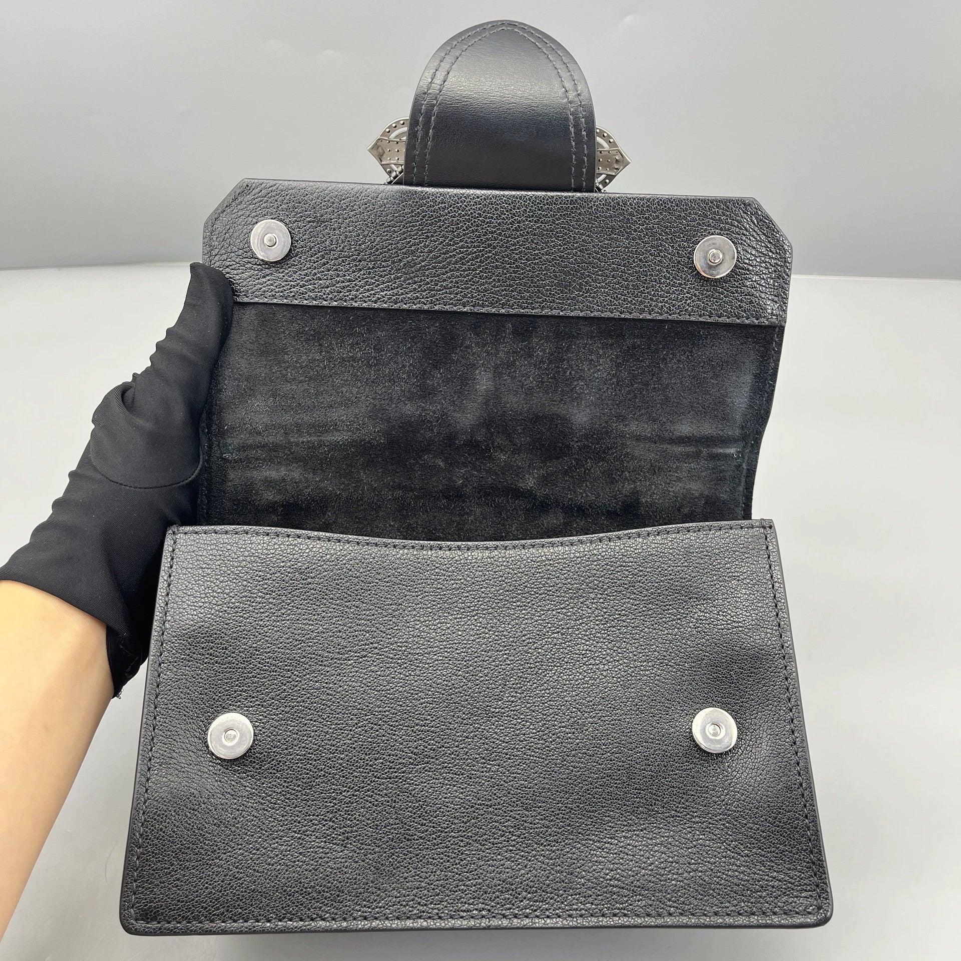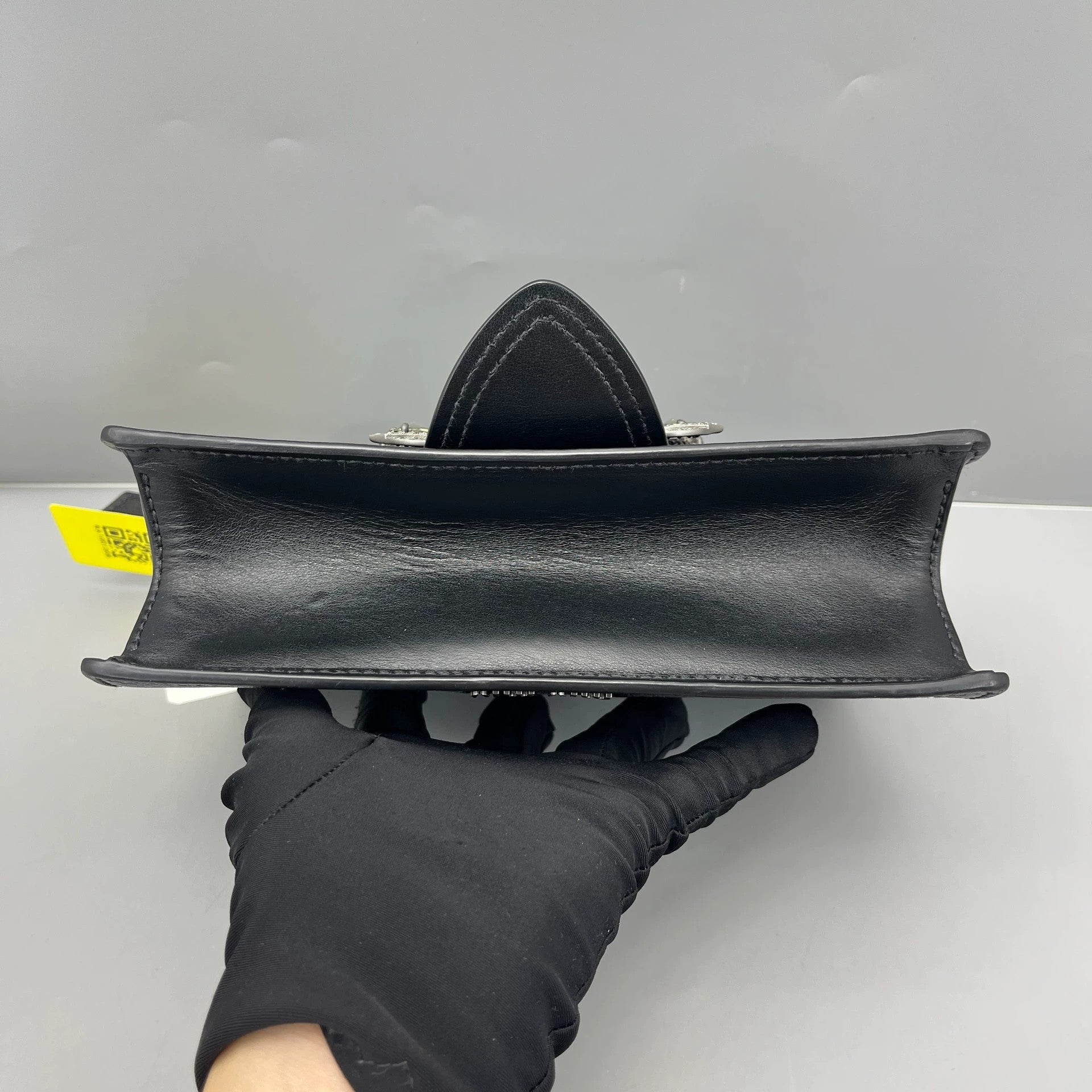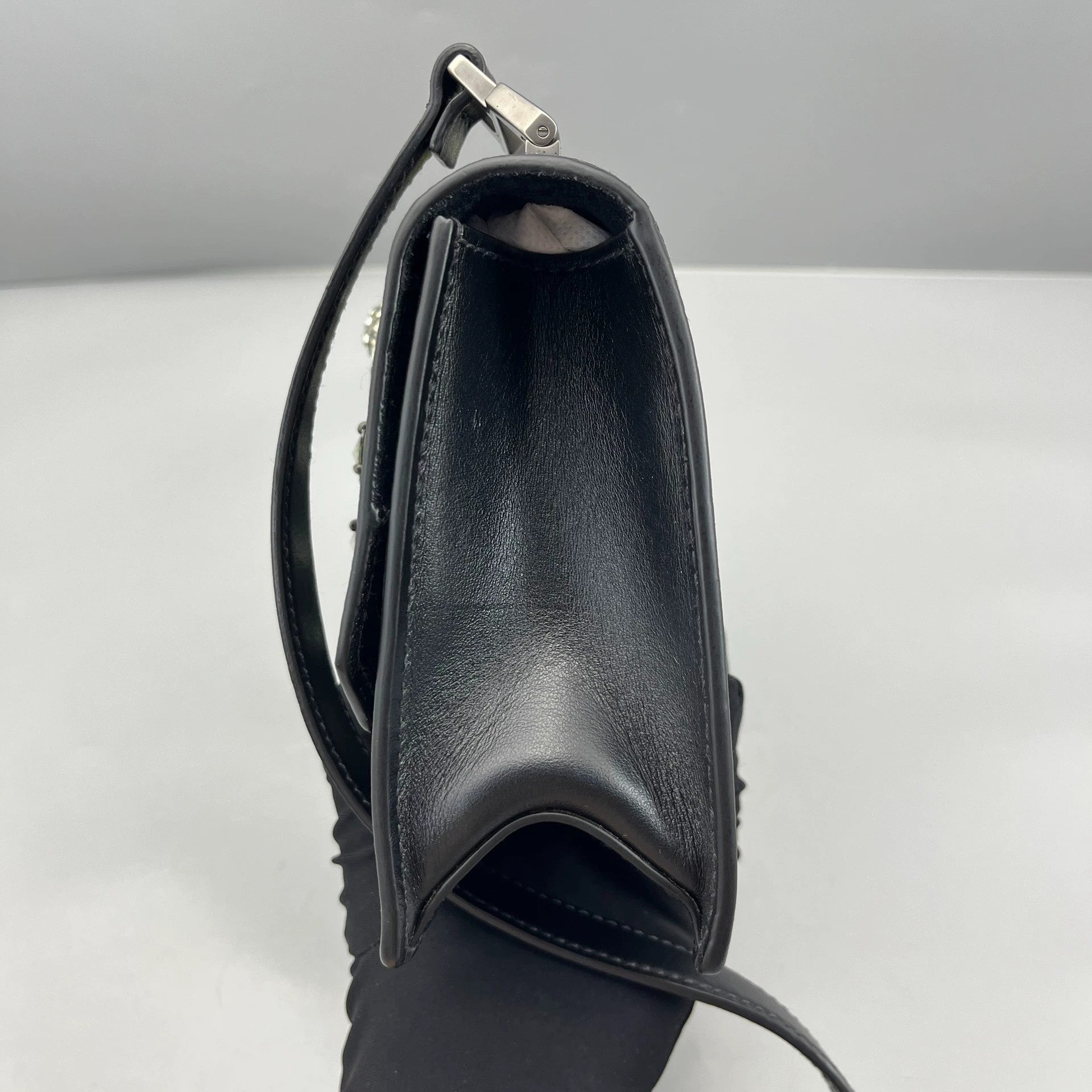 The defining feature of this Miu Miu bag is its opulent, crystal-encrusted central buckle. This statement embellishment transforms a classic black leather bag into a glamorous accessory, perfect for evening events or adding a touch of luxury to a daytime ensemble.