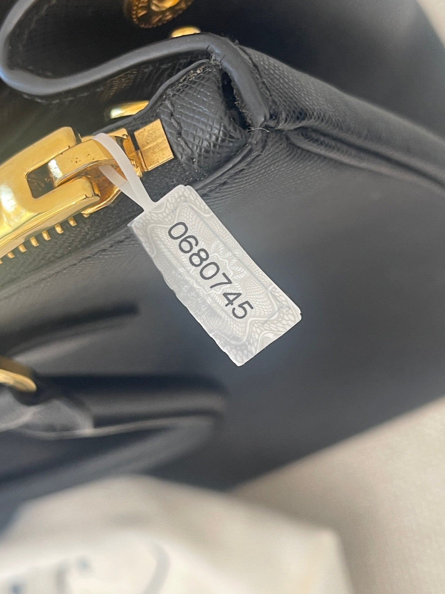 This Prada Saffiano Lux Tote in black is in very good pre-owned condition, maintaining its structured silhouette beautifully. The Saffiano leather exterior shows minimal signs of wear, with no significant scuffs or scratches visible. The gold-tone hardware, including the iconic triangular logo plaque, zipper pulls, and protective feet, remains bright and shiny with only minor hairline scratches consistent with gentle use. The interior is clean, featuring the signature Prada logo-patterned lining, and appears well-maintained without any major stains or damage. An authenticity tag with the number 0680745 is present.