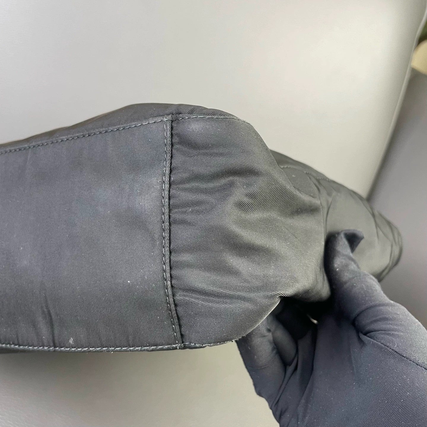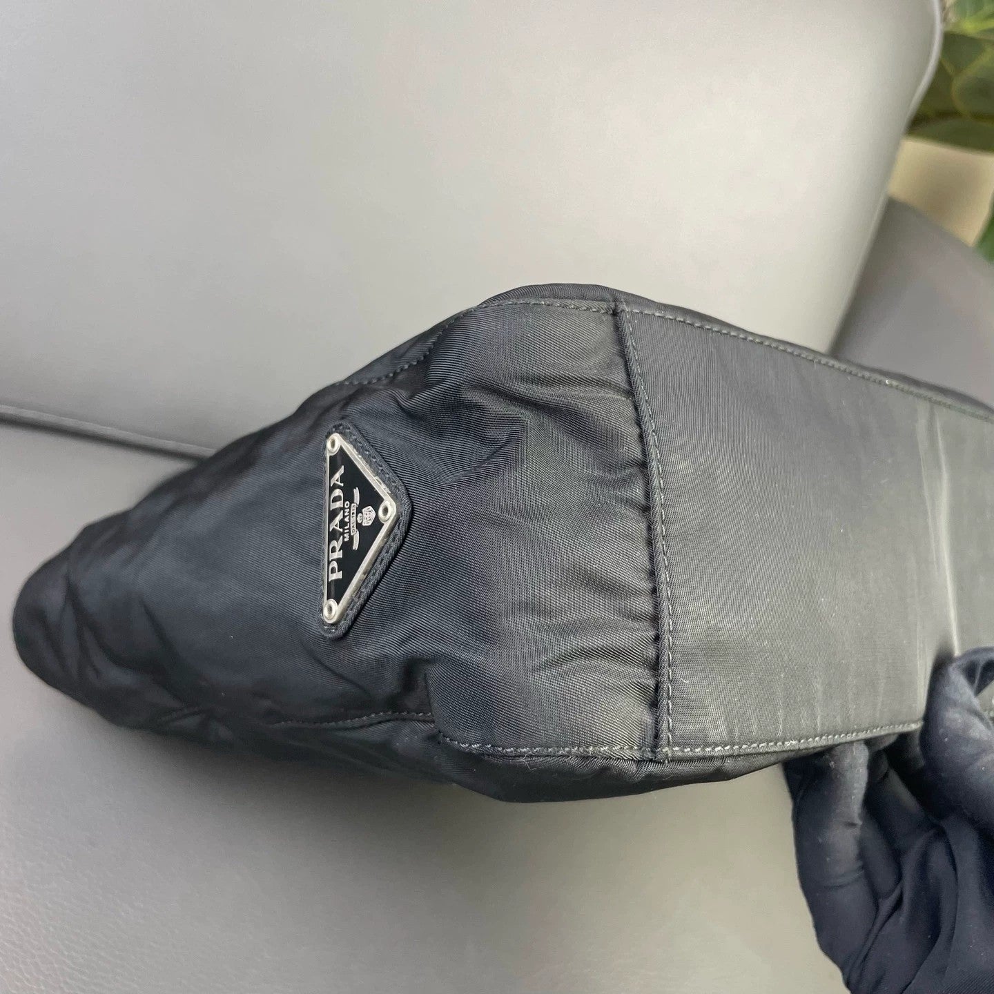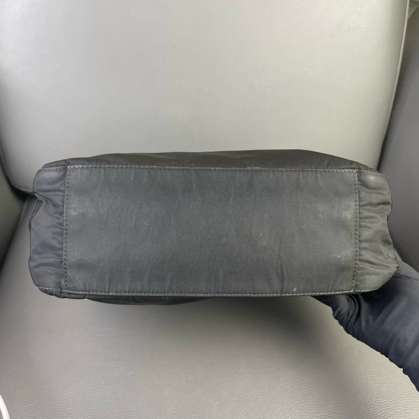 This Prada Small Tessuto Tote bag is in good pre-owned condition, exhibiting slight signs of use consistent with gentle wear. The durable Tessuto nylon exterior maintains its deep black color and overall shape with only minor softening. The silver-tone hardware, including the iconic triangular logo and zippers, remains bright with minimal superficial scratches. The top handles show light signs of handling, and the interior is clean with minor signs of use.