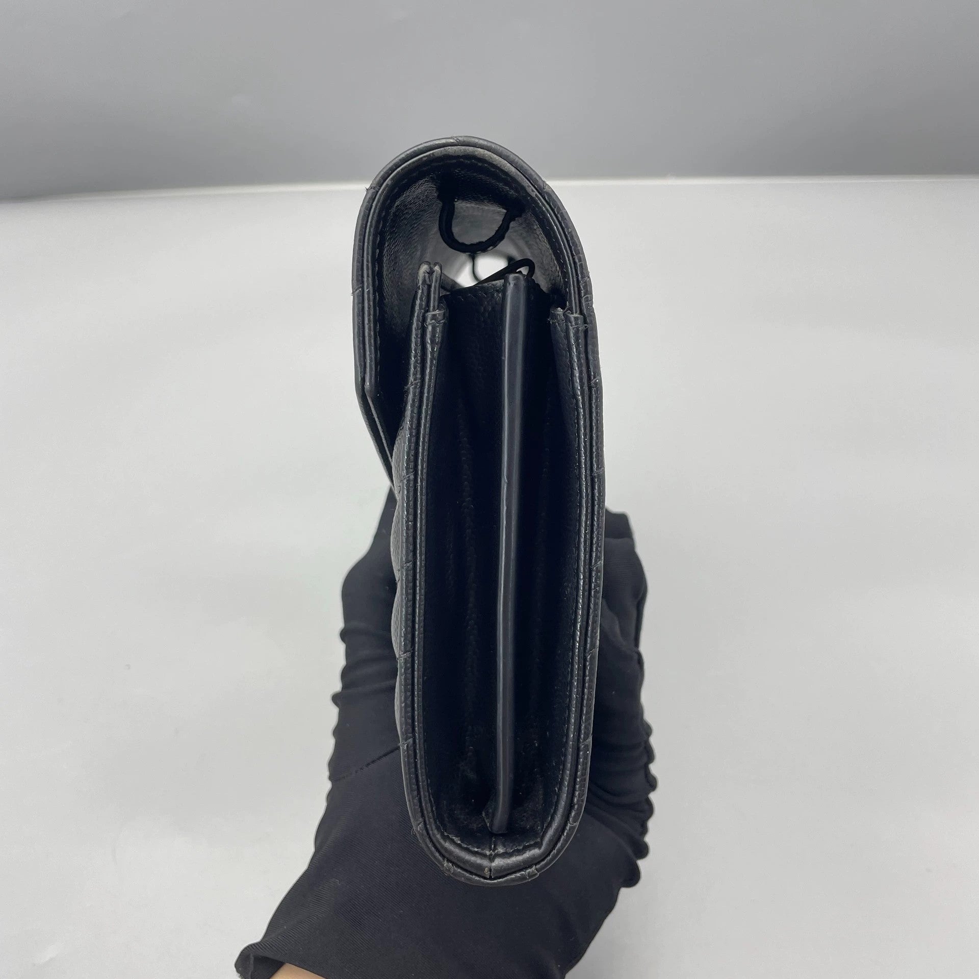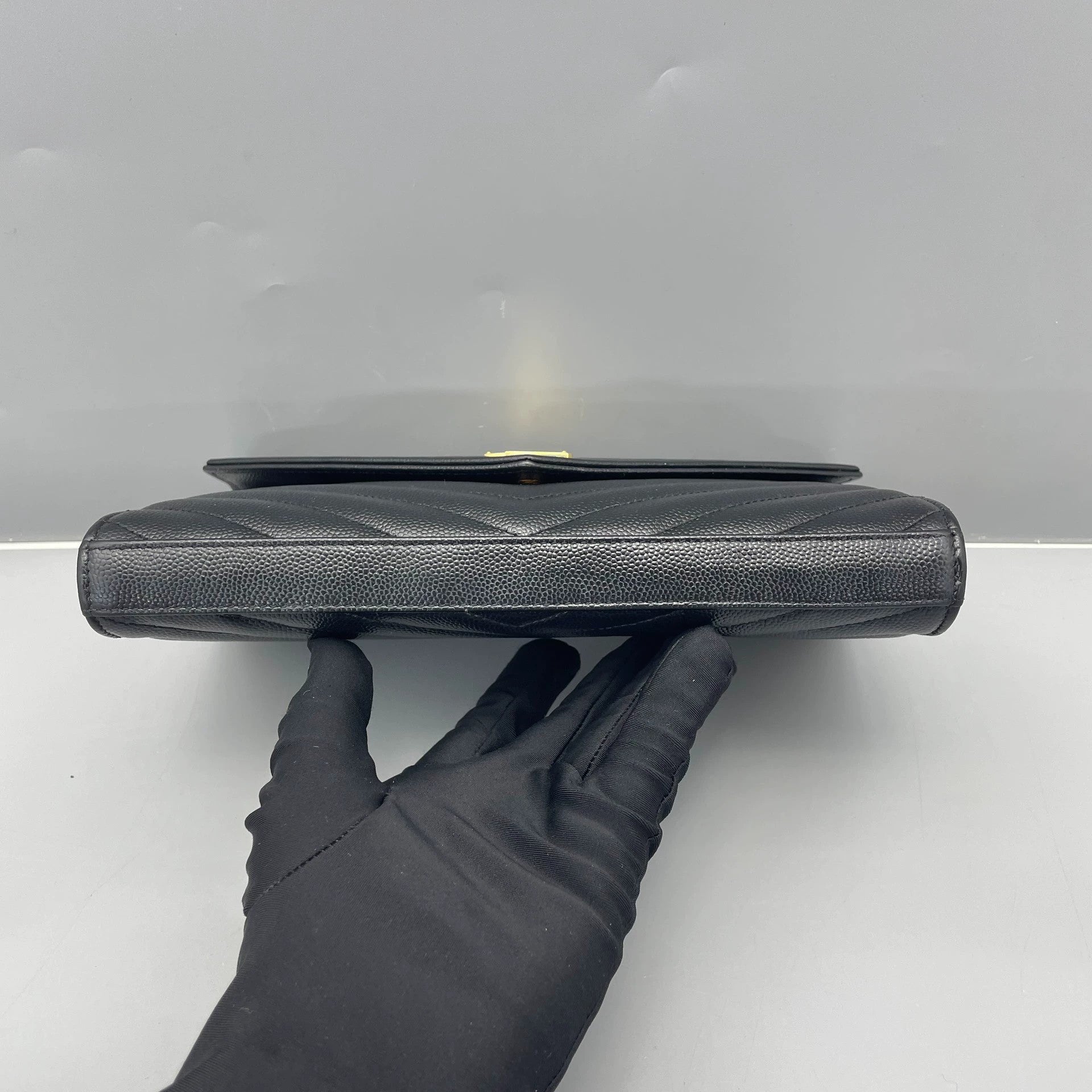 This Saint Laurent Envelope Bag is in excellent pre-owned condition, rated at 97% new. The black grained leather exterior shows minimal signs of wear, maintaining its rich texture and structured shape. The gold-tone hardware, including the iconic YSL monogram, is bright with only minor superficial hairline scratches consistent with gentle use. The interior is clean with no significant marks or damage. The overall condition reflects careful handling and preservation.