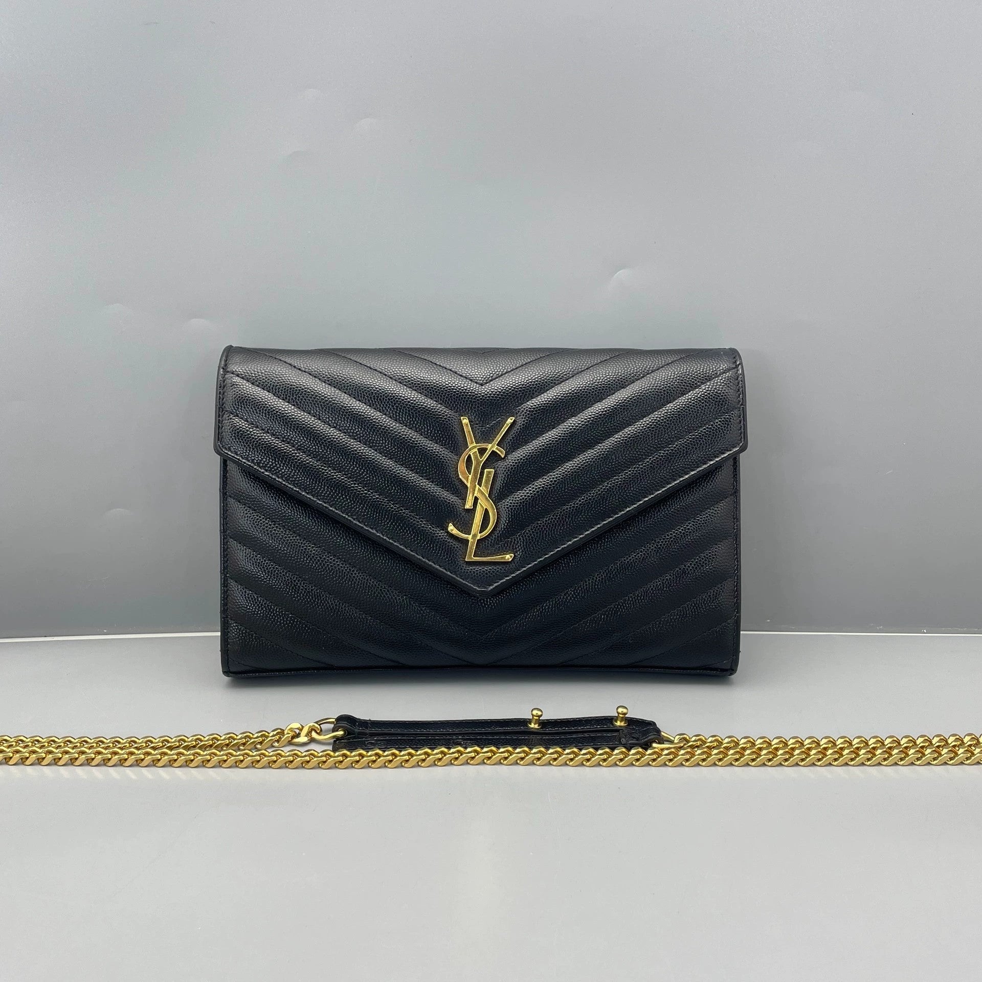 Adorned with polished gold-tone hardware, including the prominent YSL logo on the front and a versatile chain strap with a leather shoulder pad. The magnetic snap closure is fully functional and securely closes the flap.