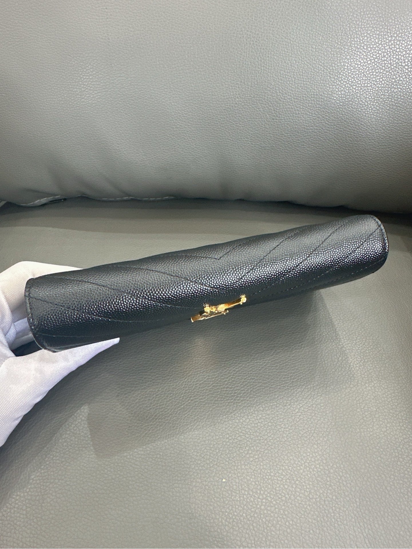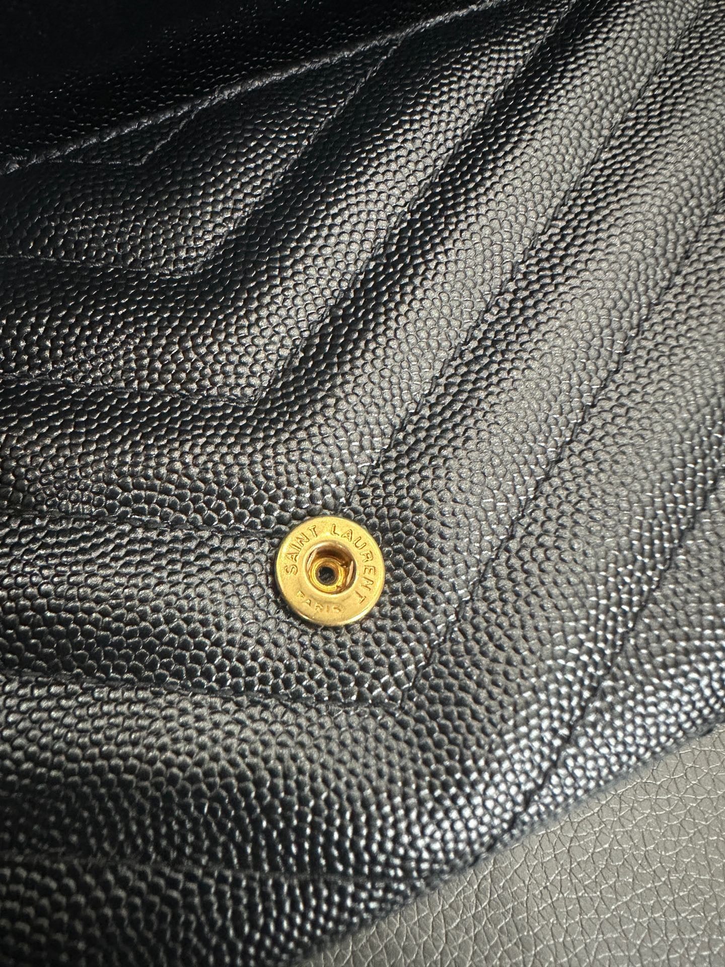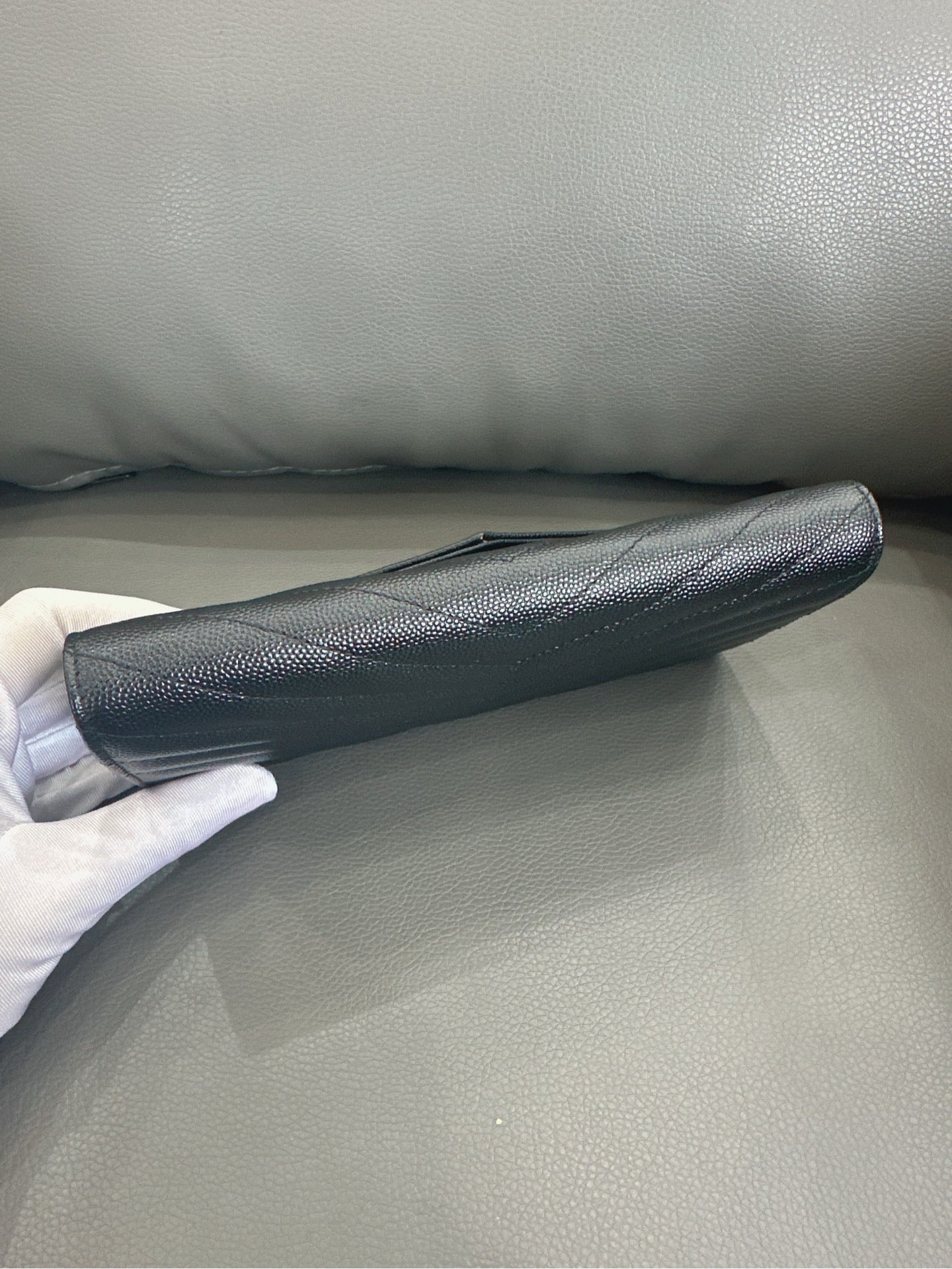 Crafted from black grain de poudre embossed leather, featuring Saint Laurent's signature chevron quilting on the front and back flap. The textured surface is durable and resistant to minor scuffs. The envelope-style flap is secured by a snap closure.
