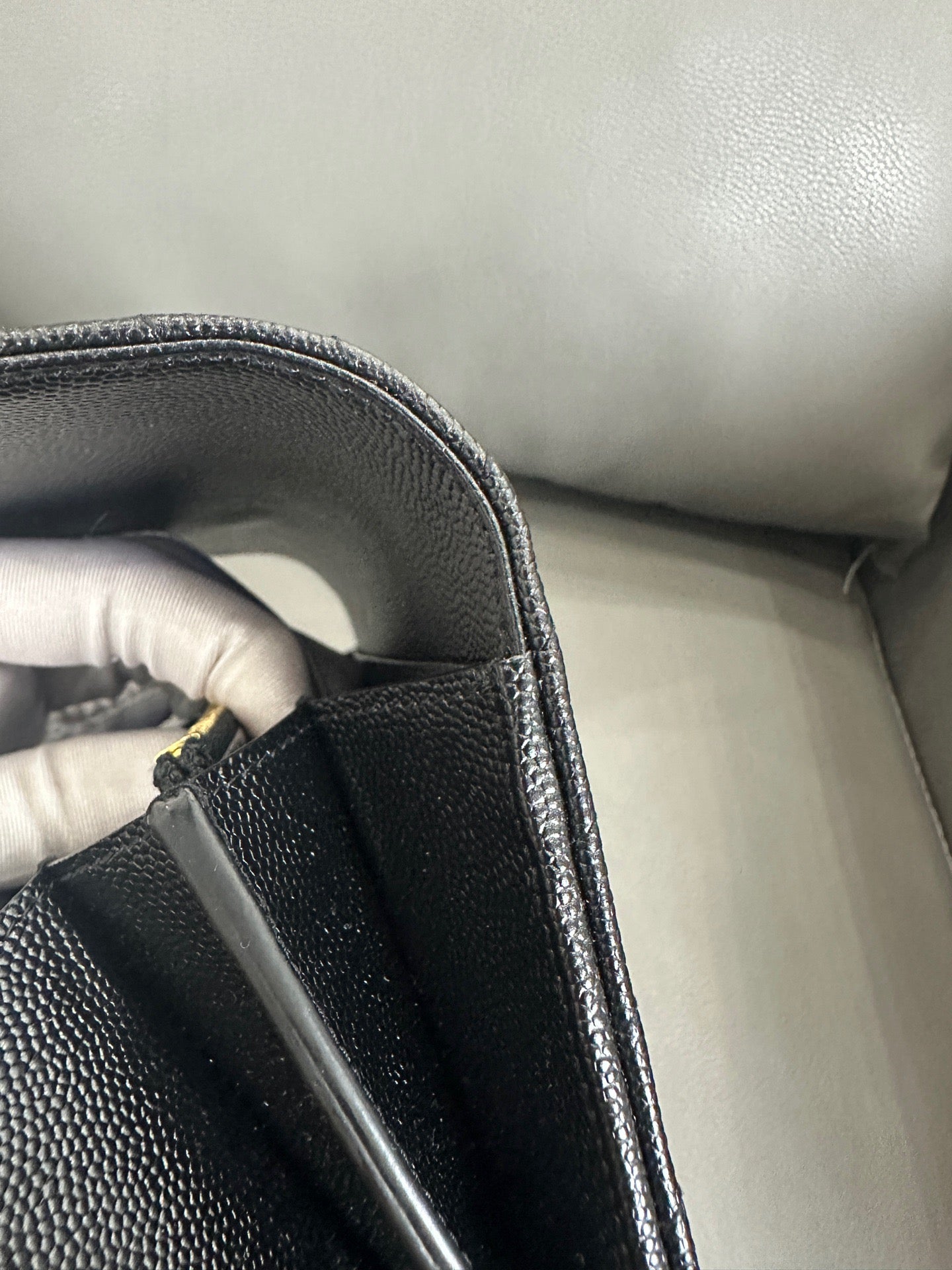This Saint Laurent Monogram Flap Wallet is in brand new condition, never used, and comes with its original packaging and documentation. The exterior leather is pristine, the hardware is gleaming, and the interior is immaculate, showing no signs of wear or handling.