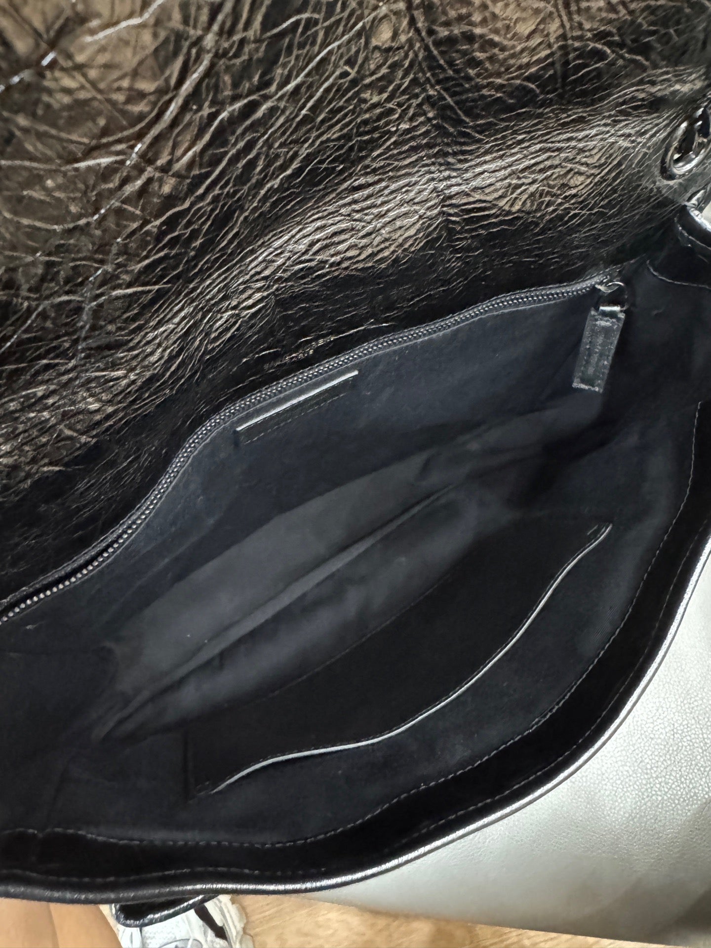 This Saint Laurent Niki Soblack Large bag from 2018 is in very good pre-owned condition. The distressed crinkled vintage leather naturally exhibits a textured appearance, and the bag shows minimal additional signs of wear consistent with careful use. The exterior is well-maintained with no significant scuffs or deep scratches beyond the intentional vintage effect of the material. The black-toned hardware, including the iconic YSL monogram and chain strap, remains intact and functional with no noticeable tarnishing or loss of finish. The interior is clean with no major stains or tears.