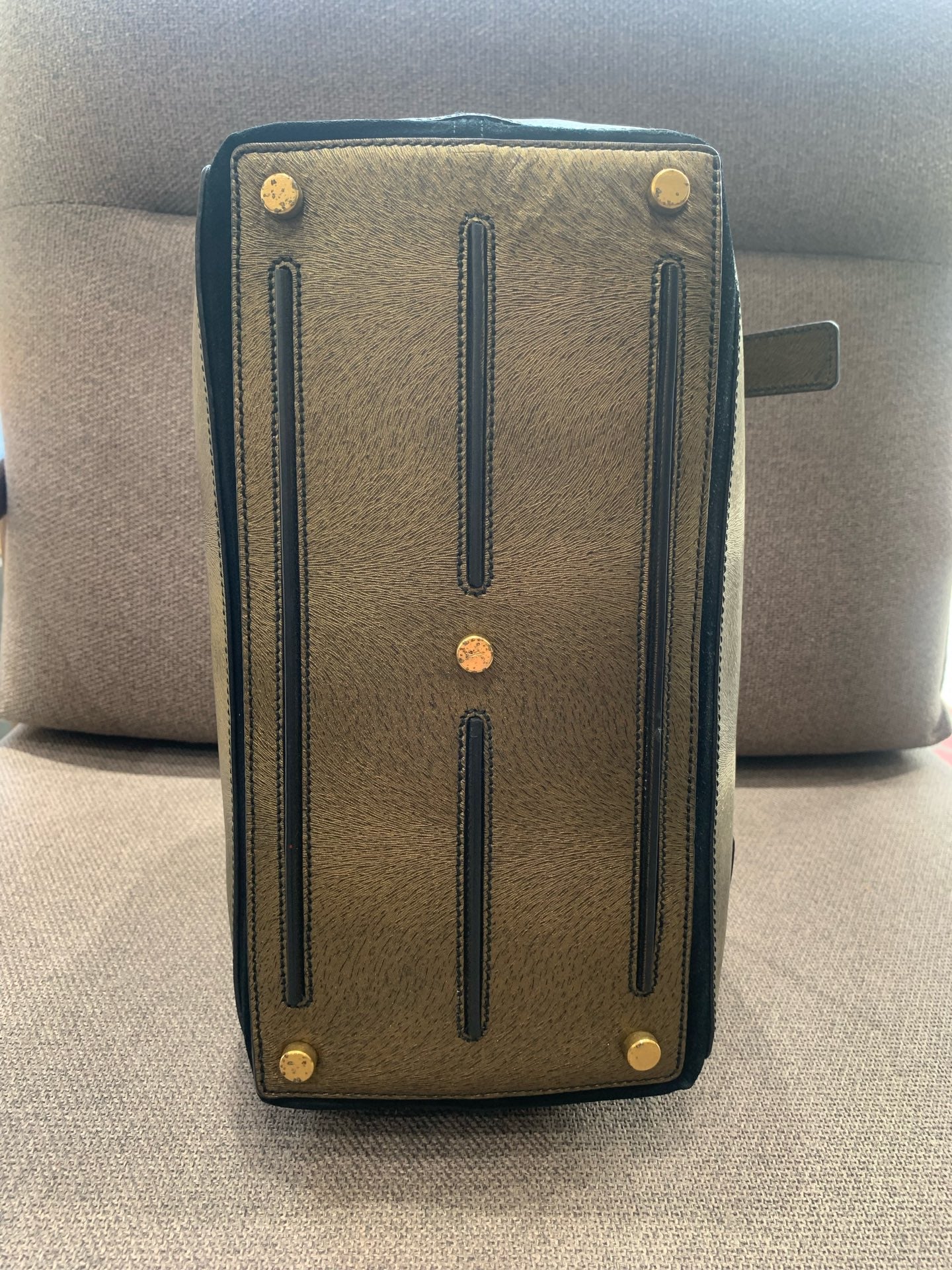This Yves Saint Laurent Muse bag is in good pre-owned condition. The exterior pony-style calfskin shows some minor signs of use consistent with gentle wear, primarily light flattening of the hair and subtle surface scuffs that blend with the textured metallic finish. The black leather trim is generally well-preserved with some minor creasing. The gold-tone hardware, including the turn-lock closure, zipper pull, and protective feet, exhibits light surface scratches and some minor tarnishing, typical for its age. The interior, lined in black suede, shows light signs of use, including some dust and minor marks, but no major stains or damage. The top handles are firm and in good condition.