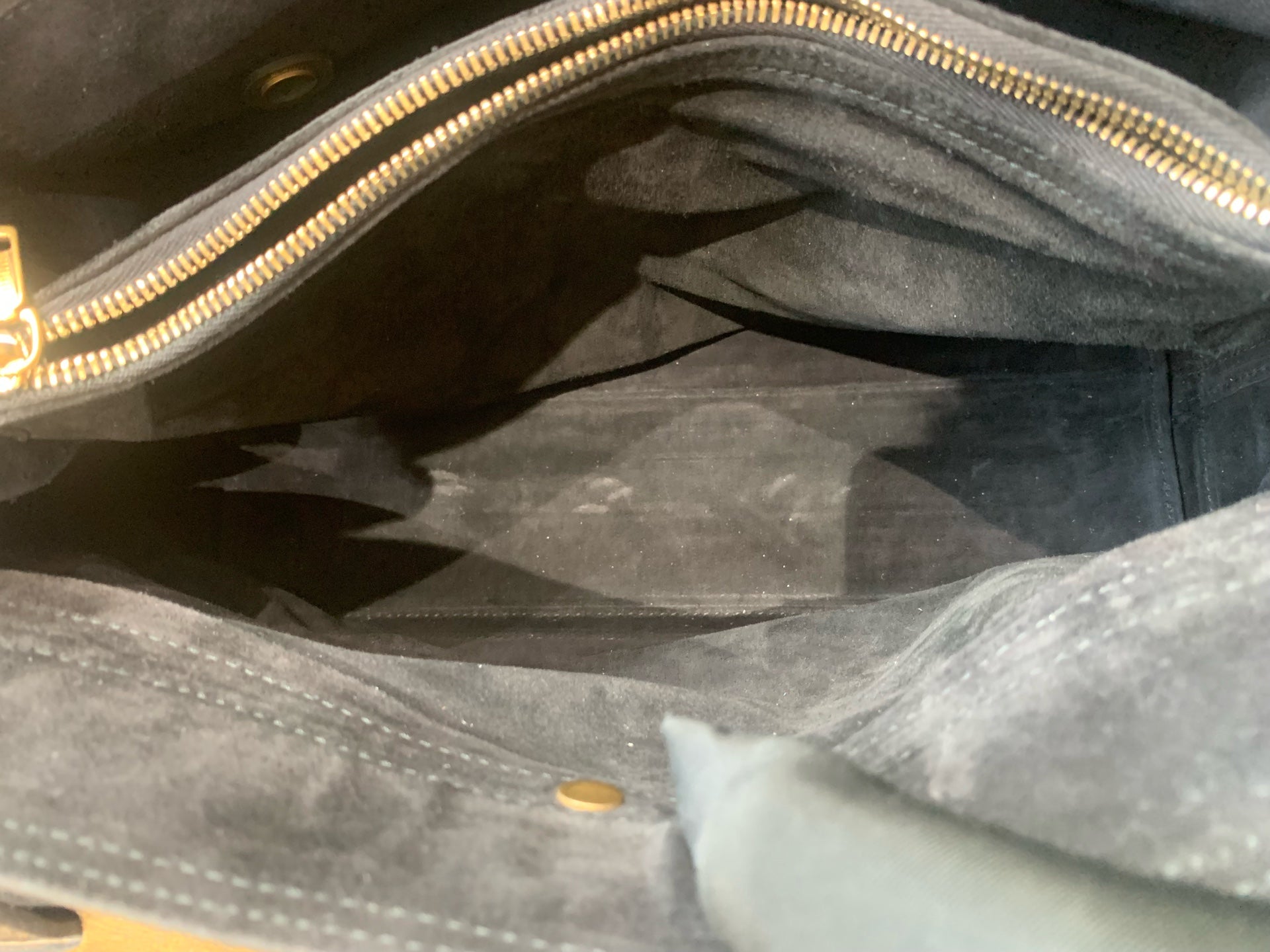 The interior is lined with soft black suede, providing a luxurious contrast to the exterior. It features a spacious main compartment and a practical internal zip pocket for securing smaller items. The interior is generally clean with minor signs of wear such as light dust and faint marks, but no significant damage.